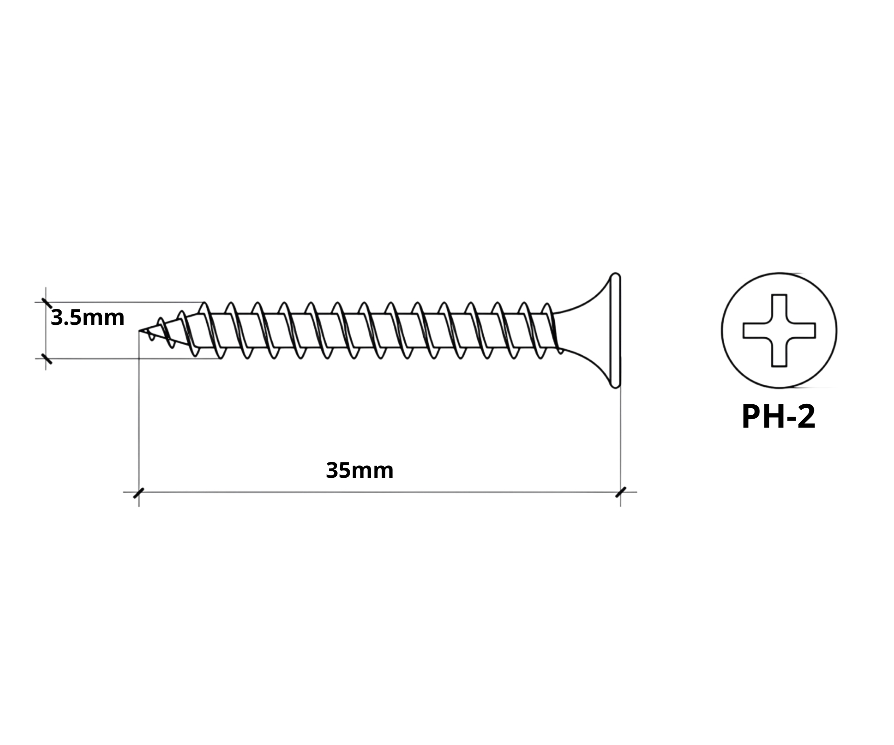 Screw dimensions: Ø 3.5  x 35 mm, PH-2