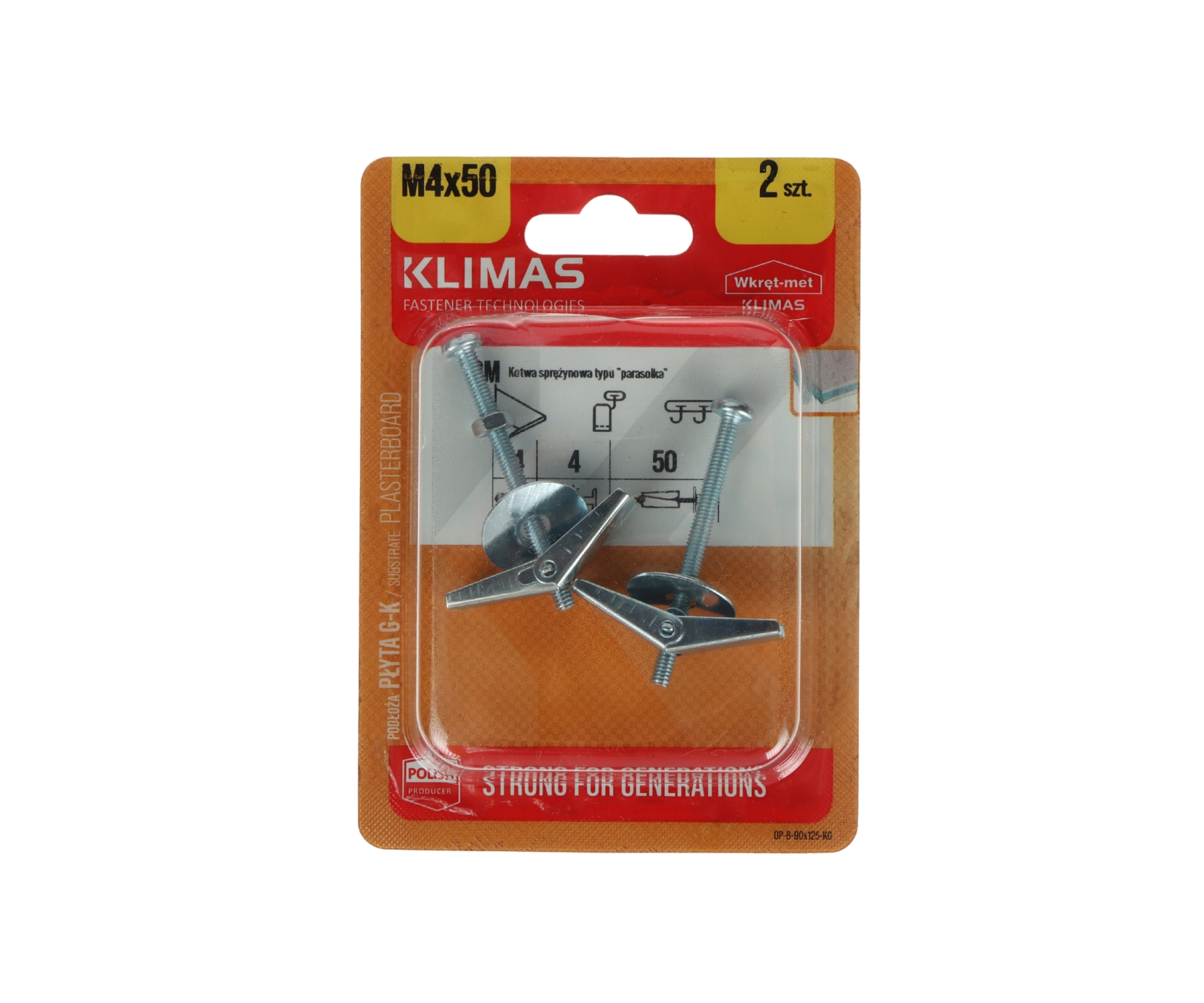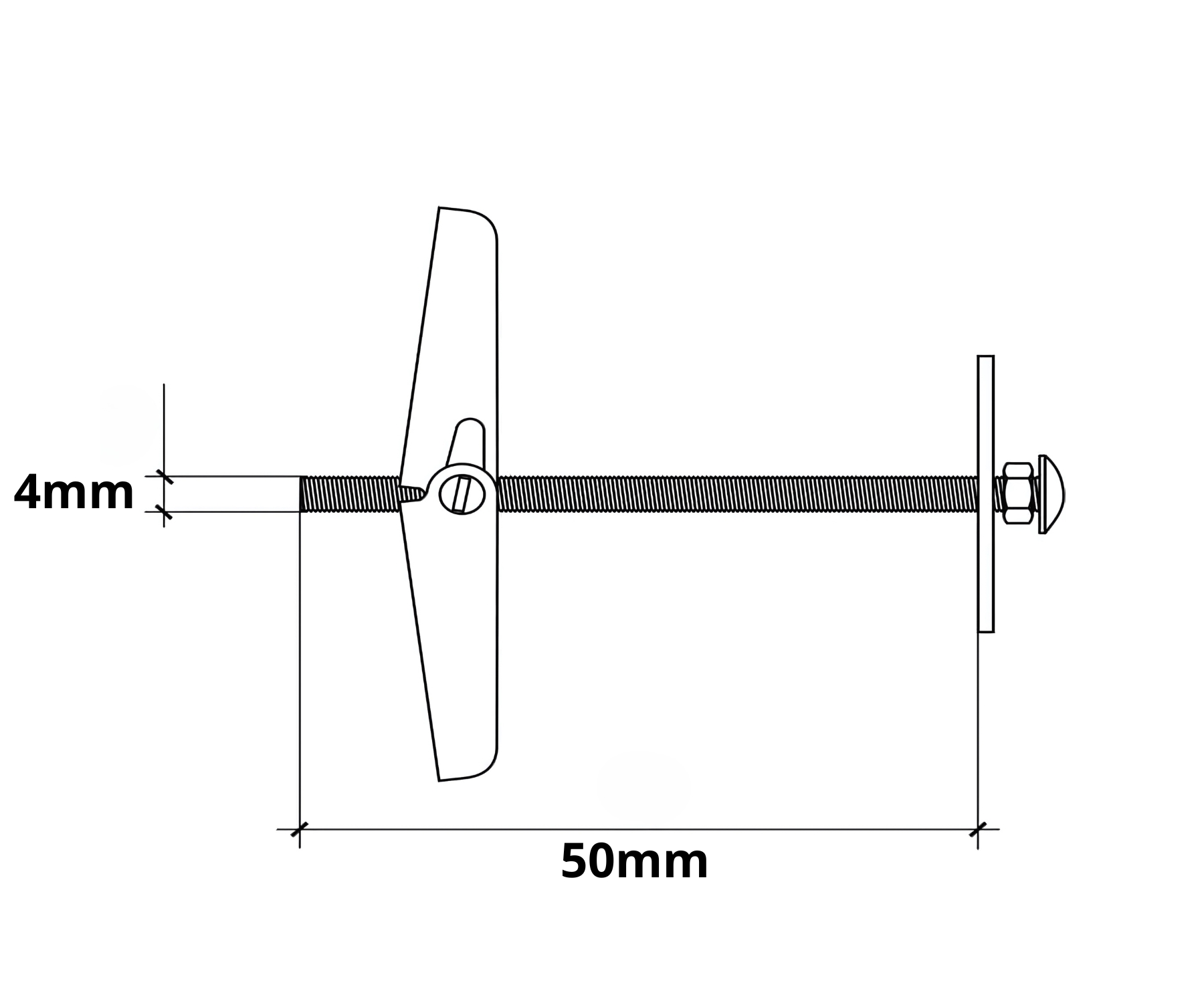 In package: 2 pcs The price for package ; Screw: M4 ; Drilling diameter: 14 mm ; Total length: 50 mm ; Application: plasterboard ;