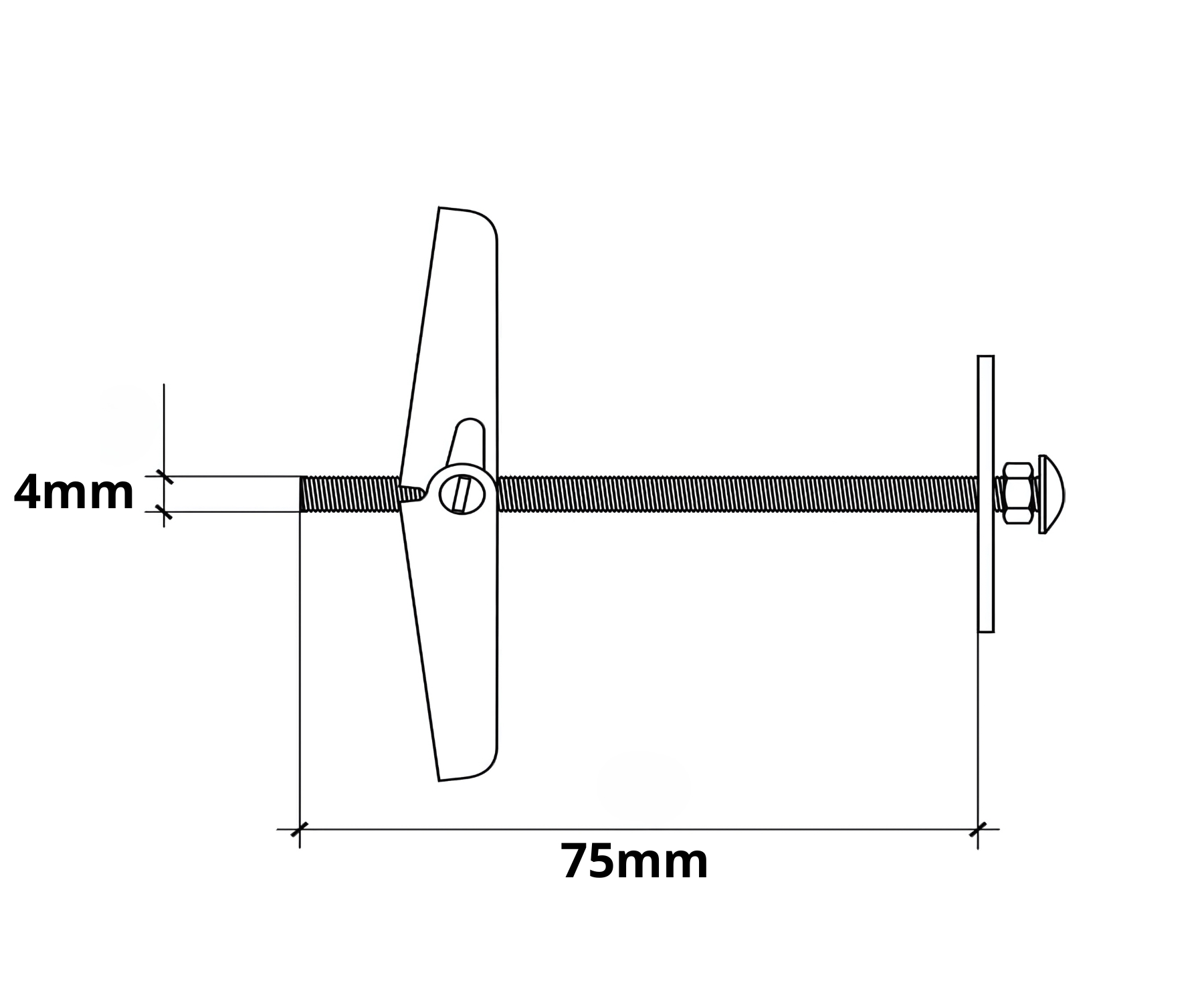 In package: 2 pcs The price for package ; Screw: M4 ; Drilling diameter: 14 mm ; Total length: 75 mm ; Application: plasterboard ;