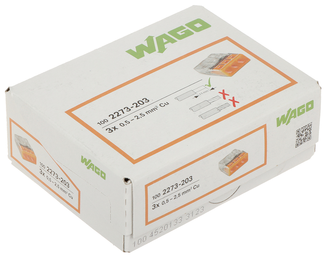 In package: 100 pcs The price for package ; Number of terminal pairs: ; Connector type: 3 x spring terminal ; Wire gauge: 0.5 ... 2.5 mm² - Wire ; Nominal voltage: 450 V ; Rated current: 24 A ; Color: Orange ;