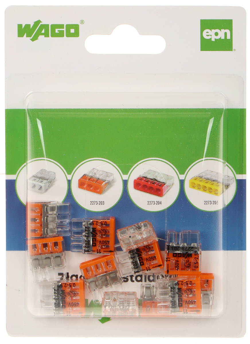 In package: 12 pcs The price for package ; Number of terminal pairs: ; Connector type: 3 x spring terminal ; Wire gauge: 0.5 ... 2.5 mm² - Wire ; Nominal voltage: 450 V ; Rated current: 24 A ; Color: Orange ;