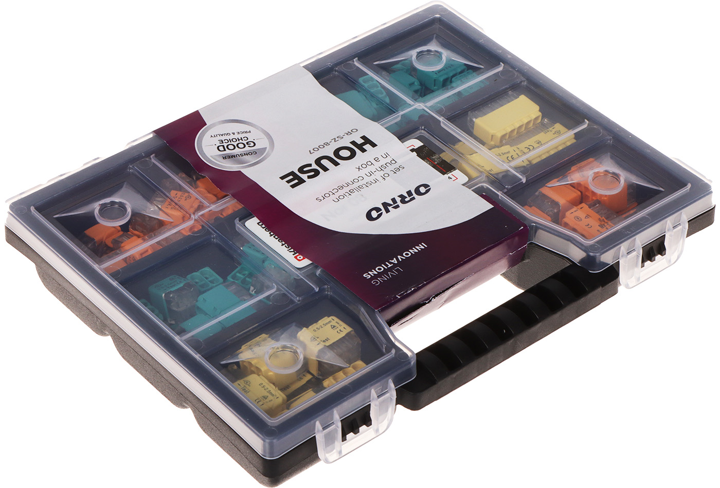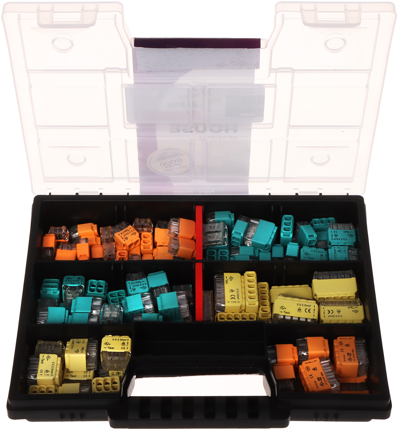 Number of pcs. in package: | 123 pcs (total) - 30 pcs - 2 x 0.75 - 2.5 mm² - 30 pcs - 3 x 0.75 - 2.5 mm² - 25 pcs - 4 x 0.75 - 2.5 mm² - 20 pcs - 5 x 0.75 - 2.5 mm² - 10 pcs - 6 x 0.75 - 2.5 mm² - 8 pcs - 8 x 0.75 - 2.5 mm² |