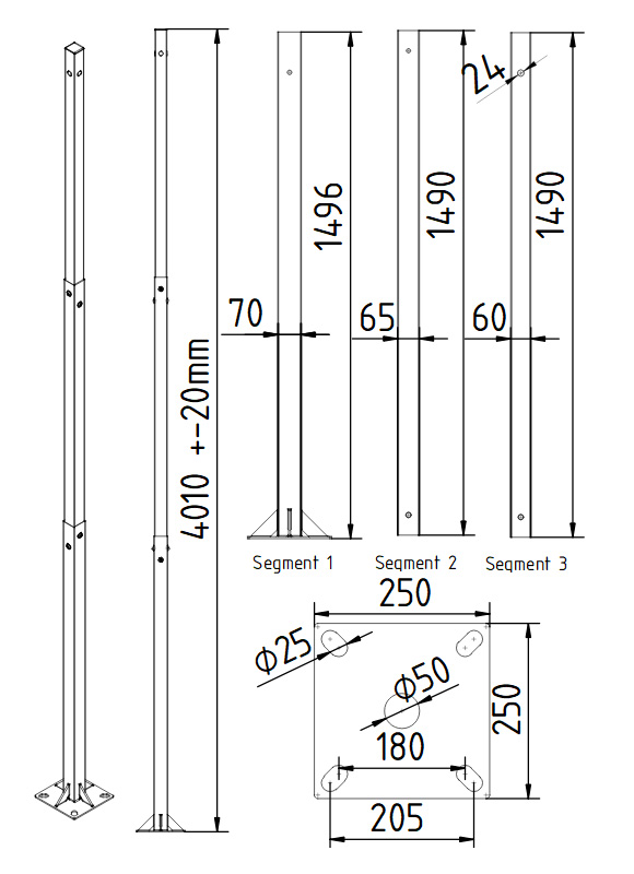 Cross-section of the pole: | Square : 70 x 70 mm - Segment 1 65 x 65 mm - Segment 2 60 x 60 mm - Segment 3 |