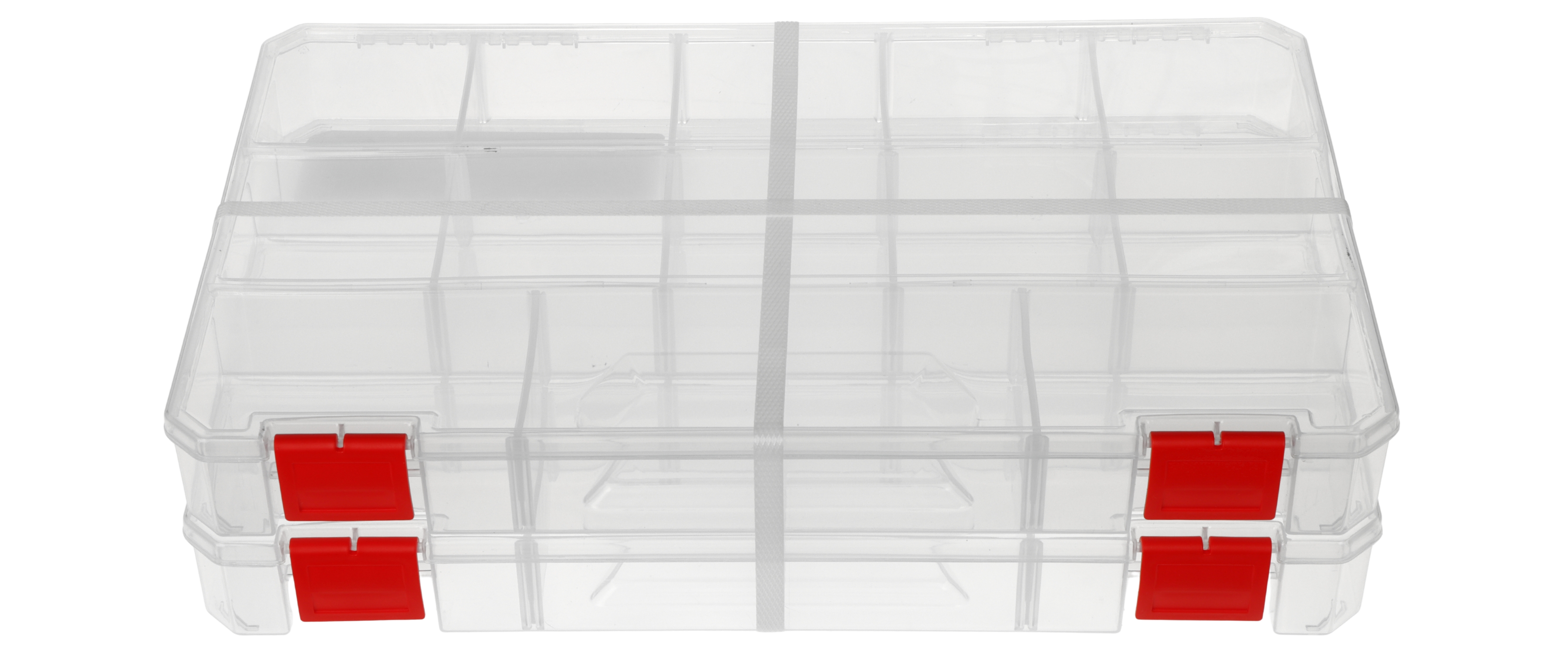 In package: 2 pcs The price for package ; Material: Plastic ; Color: Transparent ; Main features: 10 removable separators, ; External dimensions: 355 x 230 x 41 mm (single element) ; Internal dimensions: 350 x 218 x 39 mm (single element) ;