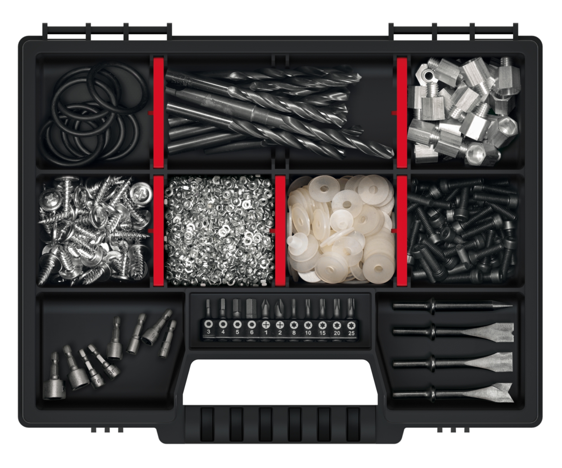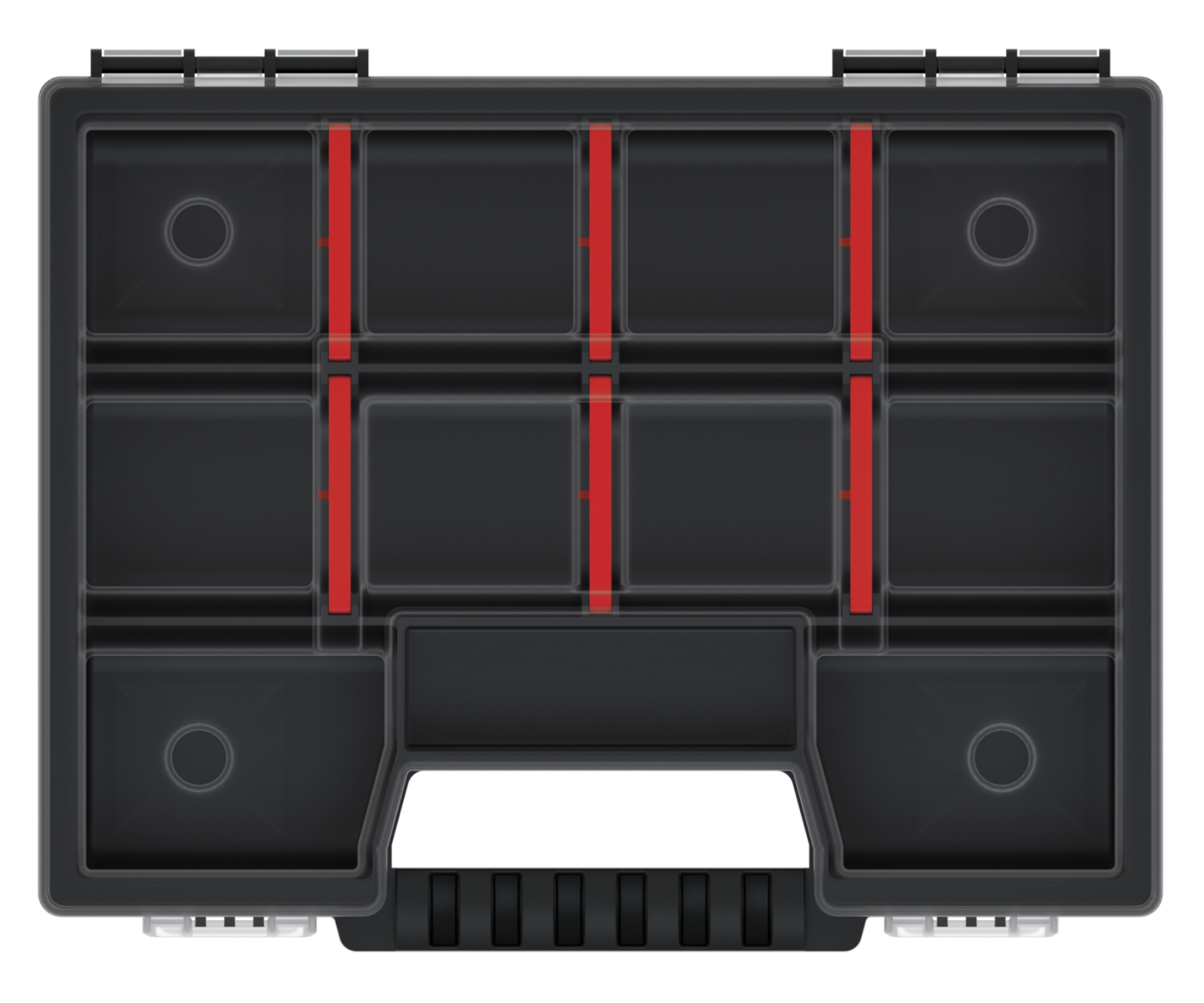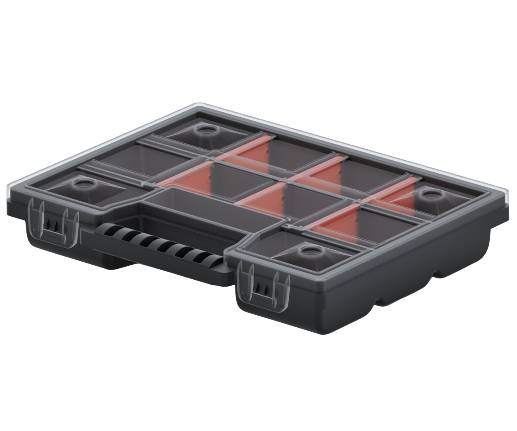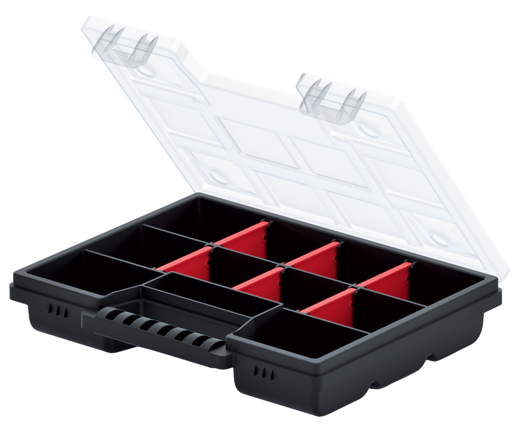 Material: Plastic ; Color: Transparent (cover) + Black ; Main features: 6 removable separators, impact resistance ; External dimensions: 195 x 155 x 35 mm ; Internal dimensions: 180 x 132 x 30 mm ;