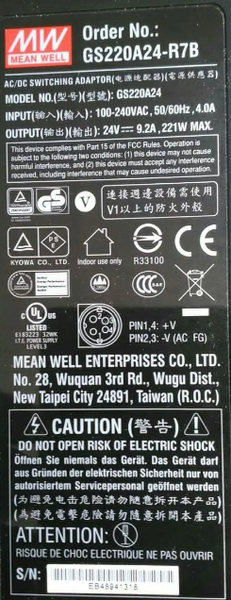 AC-DC Industrial desktop adaptor with 3 pin IEC320-C14 input socket; Output 24VDC at 9.2A with DIN 4 pin plug with lock; Class I; GS220A24-R7B is succeeded by GST220A24-R7B.