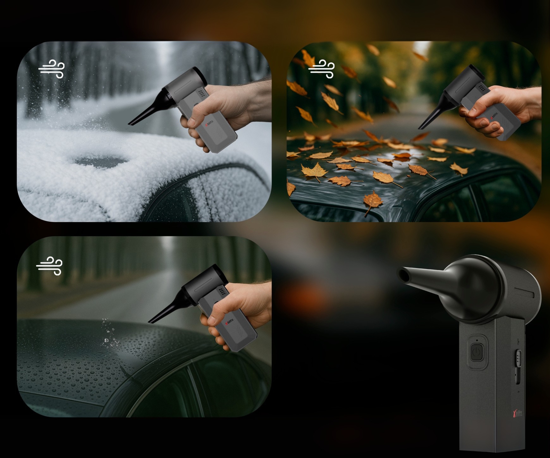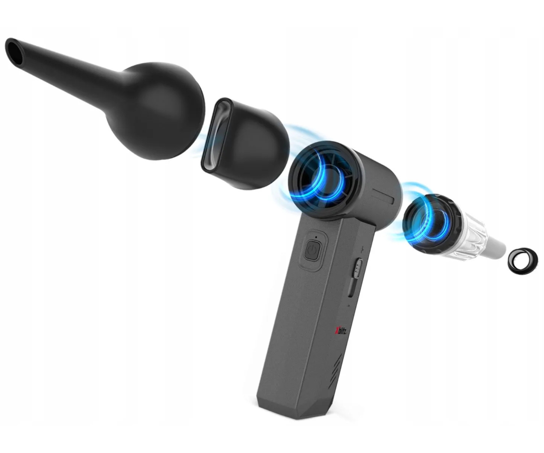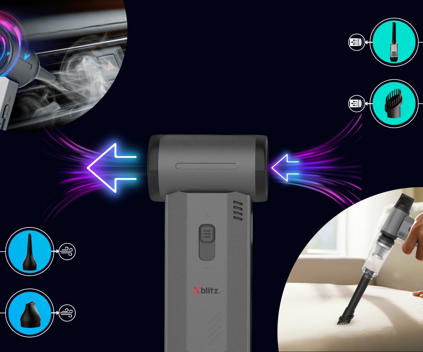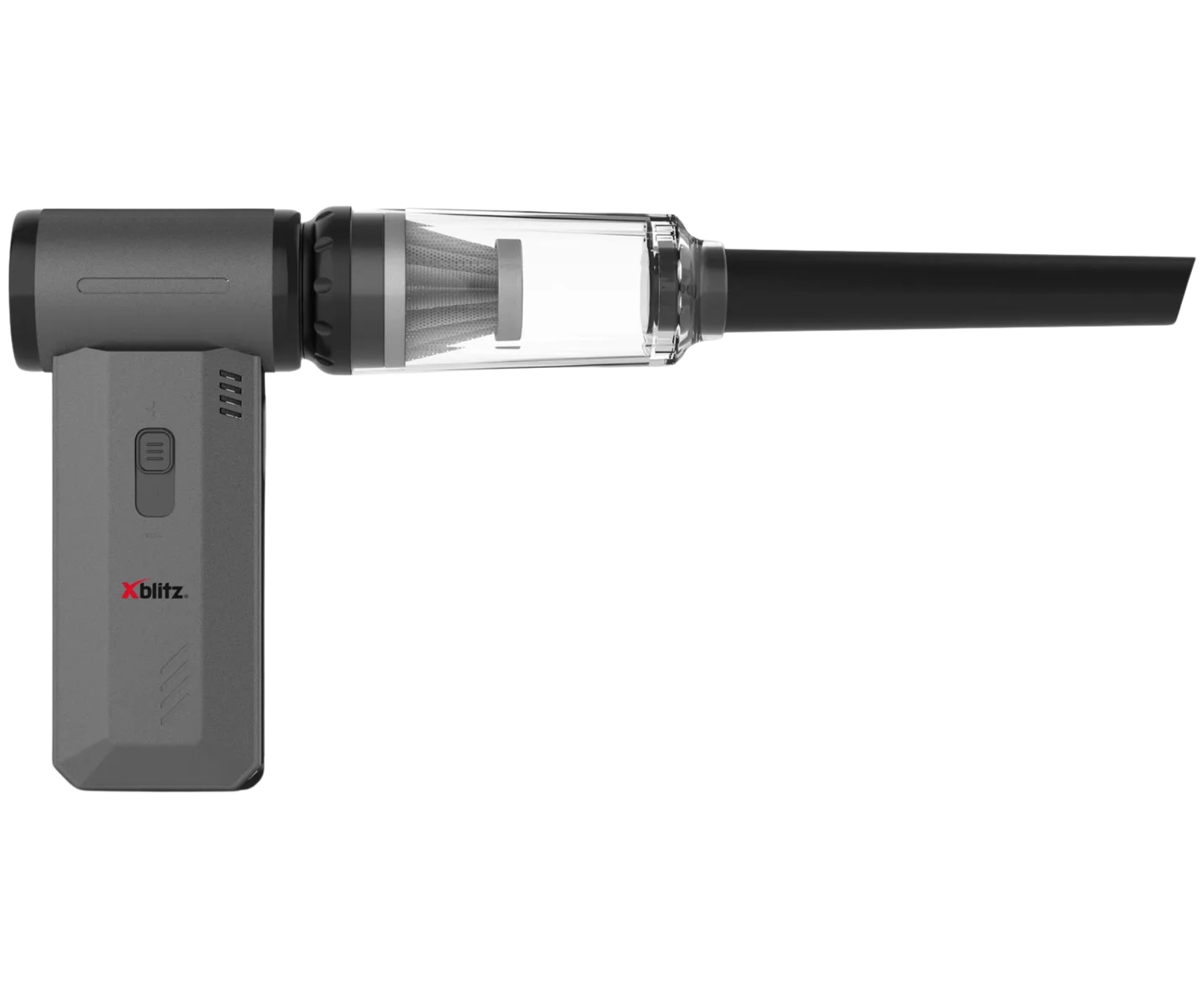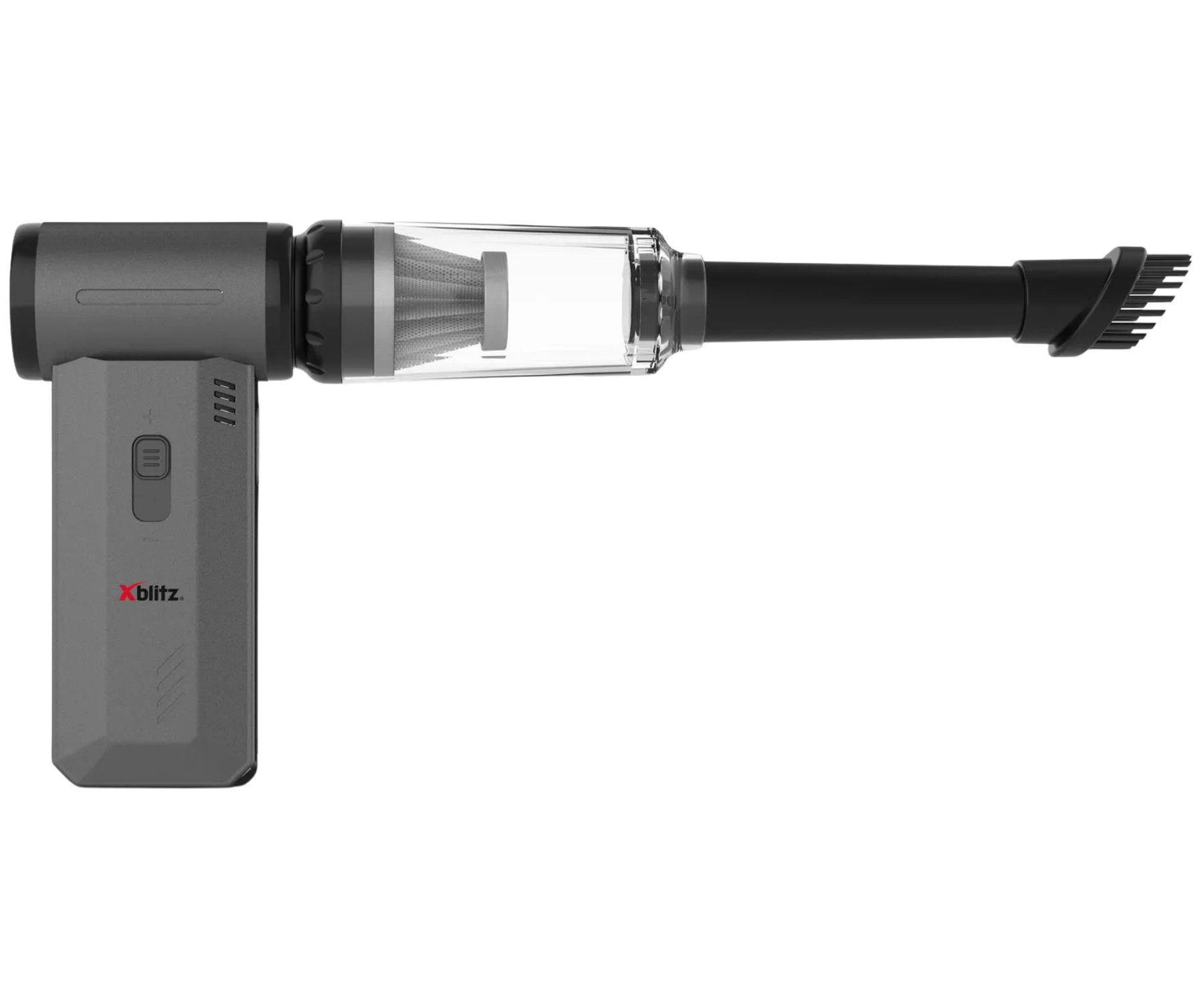 Xblitz Dragon - a compact 2-in-1 device for vacuuming and blowing. Equipped with a brushless 200W motor and four tips (tube, brush, short and long nozzle), it allows you to effectively clean both upholstery or car interior, as well as delicate surfaces - keyboard, fan or camera.; Spindle speed: 60 000 ... 130 000 RPM ; Main features: Brushless motor, Smooth speed control ; Battery: 8000 mAh Li-Ion ; Typical battery charge time: max. 3 h ; Working time: 12 ... 120 min ;