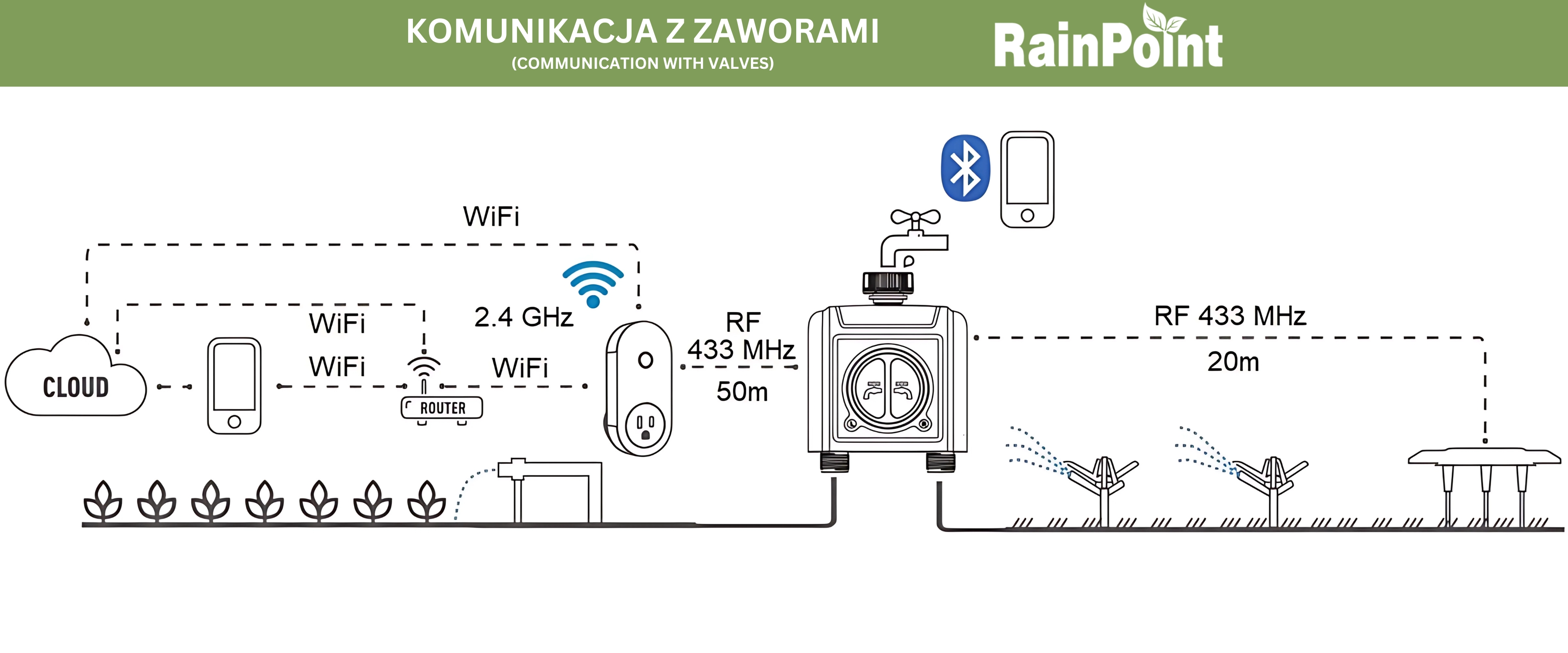 Type (size): 3/4 " ; Working pressure: 0.5 bar ... 8 bar ; Water flow: 5 ... 35 l/min ; Wireless: 433.92 MHz, Bluetooth 5.0 ; Main features: manual watering (app or button), 3 time schedules / day - for each zone, automatic watering, remote access - Wi-Fi gateway (included) ; Power supply: 4 pcs alkaline battery 1.5 V LR6 (AA) ;