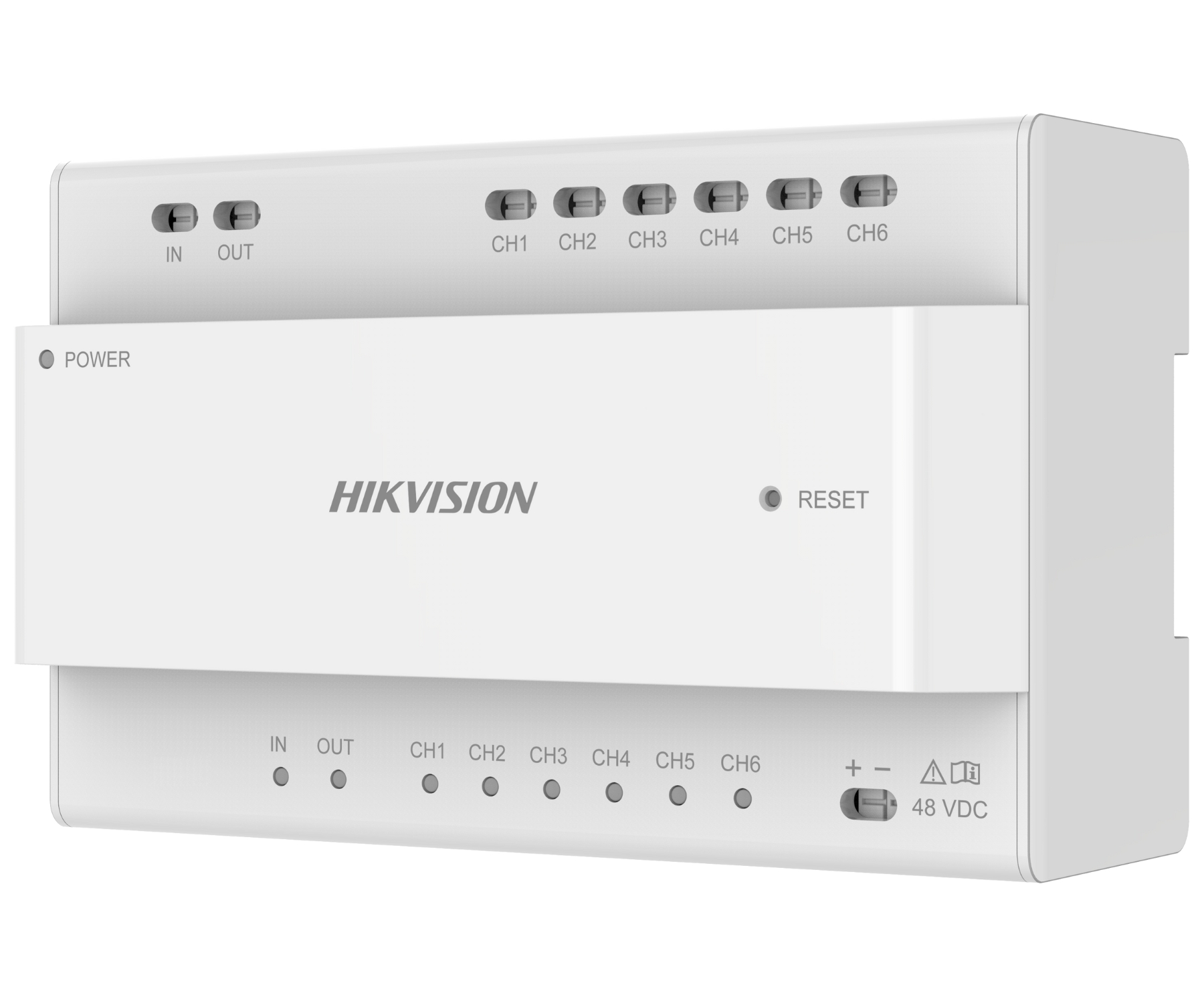 Two-channel distributor for dual-cable installation with eight dual-cable interfaces (IN/OUT configuration for cascading and CH1-CH6 for inter-building communications), supporting cascading of this series of devices. DIN rail mounting, 48 VDC power supply, <10 W power consumption, eight signal indicators.;
