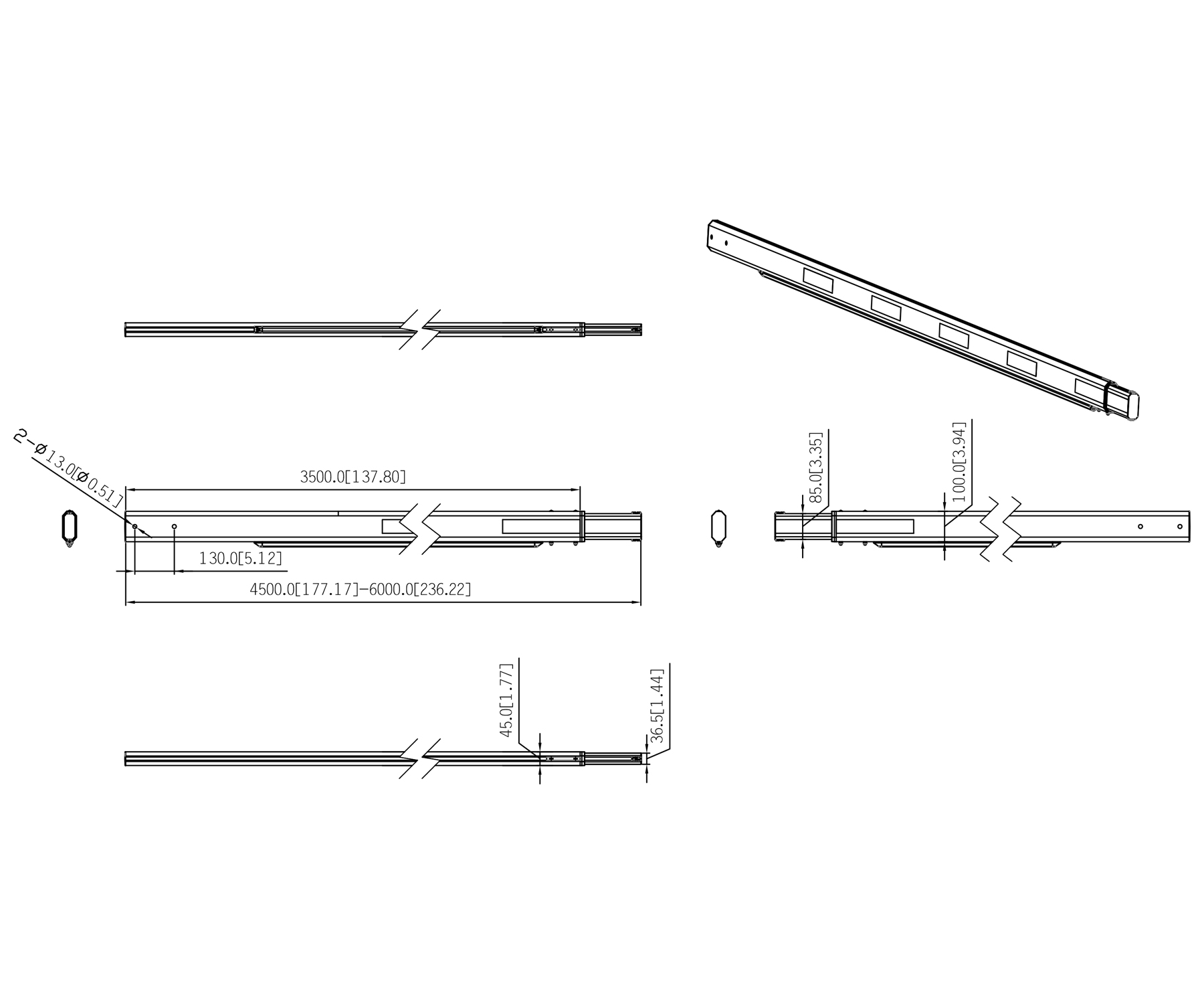 Dimensions: (4500 ... 6000) mm x 100 mm x 45 mm