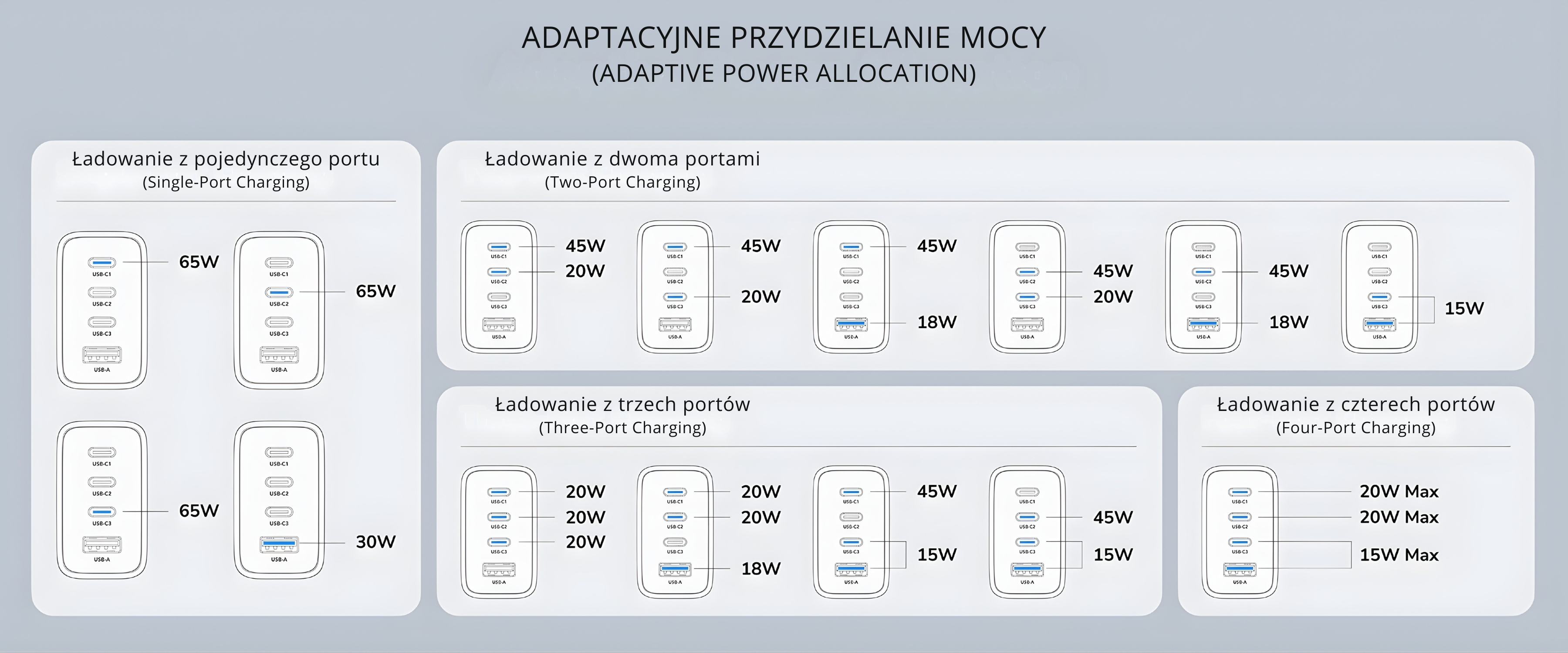 Output power: 65 W (max) ; Output: USB-C1 output - PD 65 W (max) USB-C2 output - PD 65 W (max) USB-C3 output - PD 65 W (max) ; Main features: fast charging : Compatible with PD2.0; PD3.0; PPS; QC2.0; QC3.0; QC4.0+; Huawei FCP; SCP; Samsung AFC; 2.0A; Apple 2.4A; BC1.2 ;