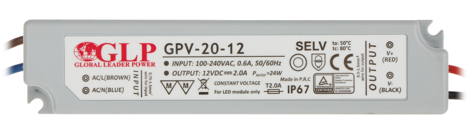 Output voltage: 12 V DC ; Maximal load: 2 A ; Output power: 24 W ; "Index of Protection": IP67 ;