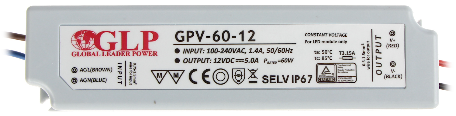 Output voltage: 12 V DC ; Maximal load: 5 A ; Output power: 60 W ; "Index of Protection": IP67 ;