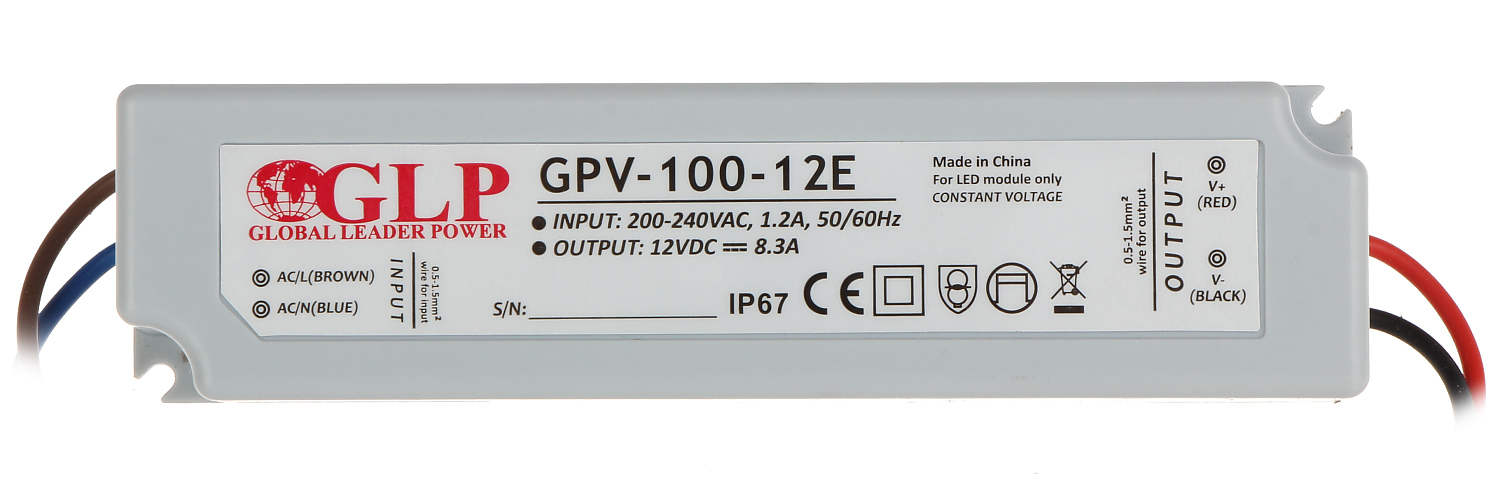 Output voltage: 12 V DC ; Maximal load: 8.3 A ; Output power: 100 W ; "Index of Protection": IP67 ;