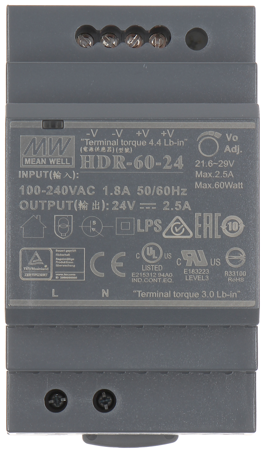 Output voltage: 24 V DC ; Output voltage adjustment: 21.6 V ... 29 V ; Maximal load: 2.5 A ; Output power: 60 W ;