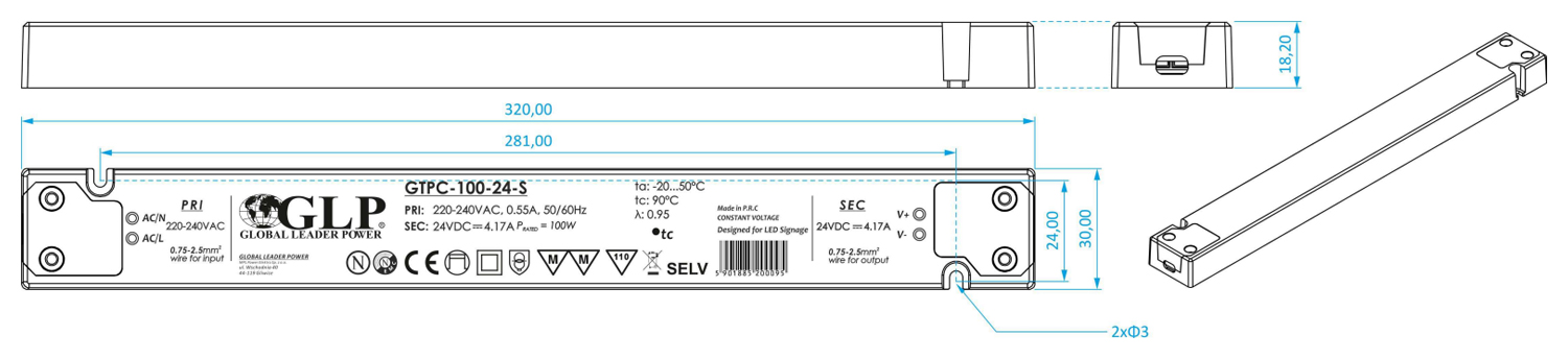 Output voltage: 24 V DC ; Maximal load: 4.17 A ; Output power: 100 W ;