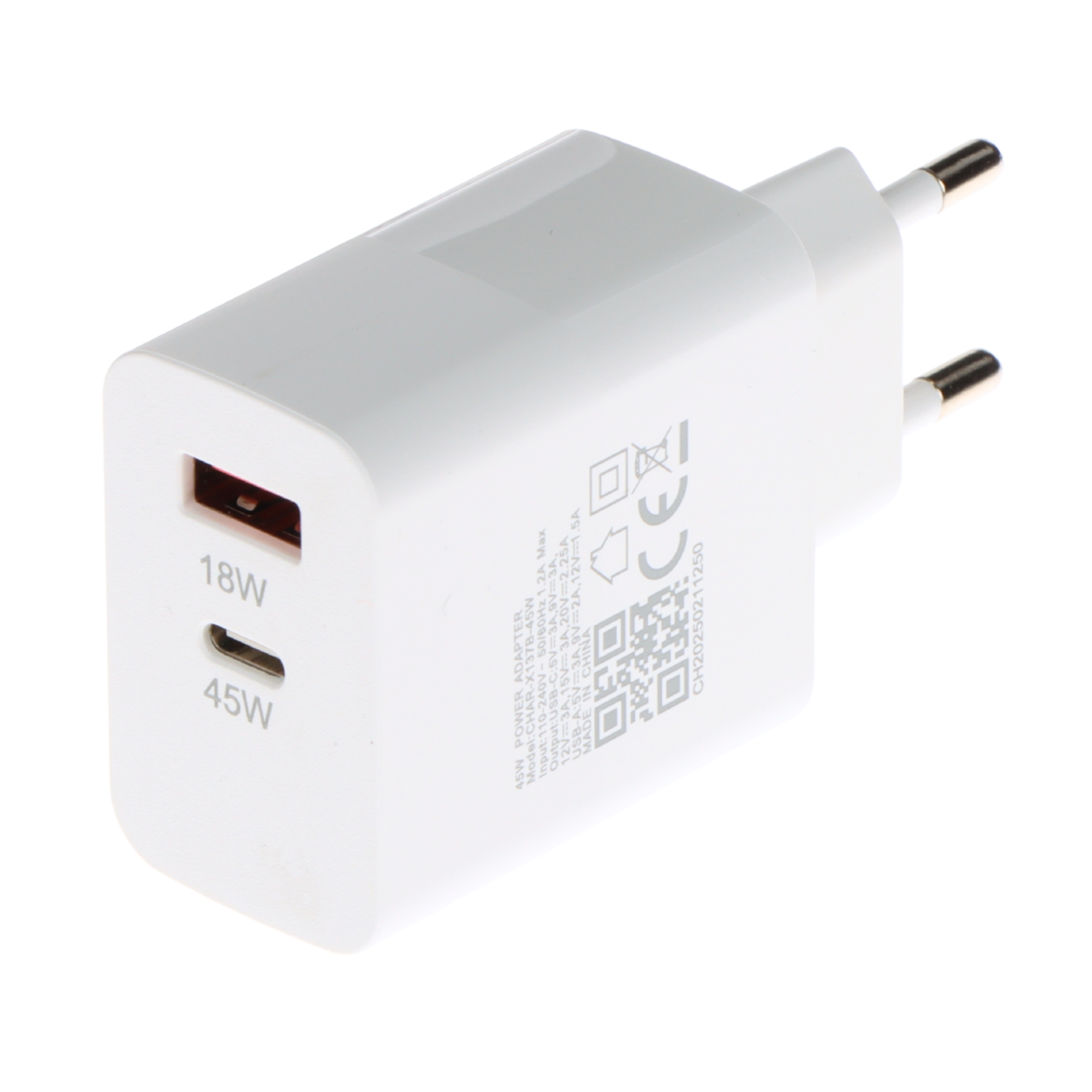 Output power: max. 45 W (total) ; Output: USB-C output :   5 V / 3 A,   9 V / 3 A,   12 V / 3 A,   15 V / 3 A,   20 V / 2.25 A ; USB-A output :   5 V / 3 A,   9 V / 2 A,   12 V / 1.5 A ; Main features: Quick Charge 3.0, Power Delivery ; Input voltage: 100 ... 240 V AC ; Manufacturer / Brand: Delta Power ;