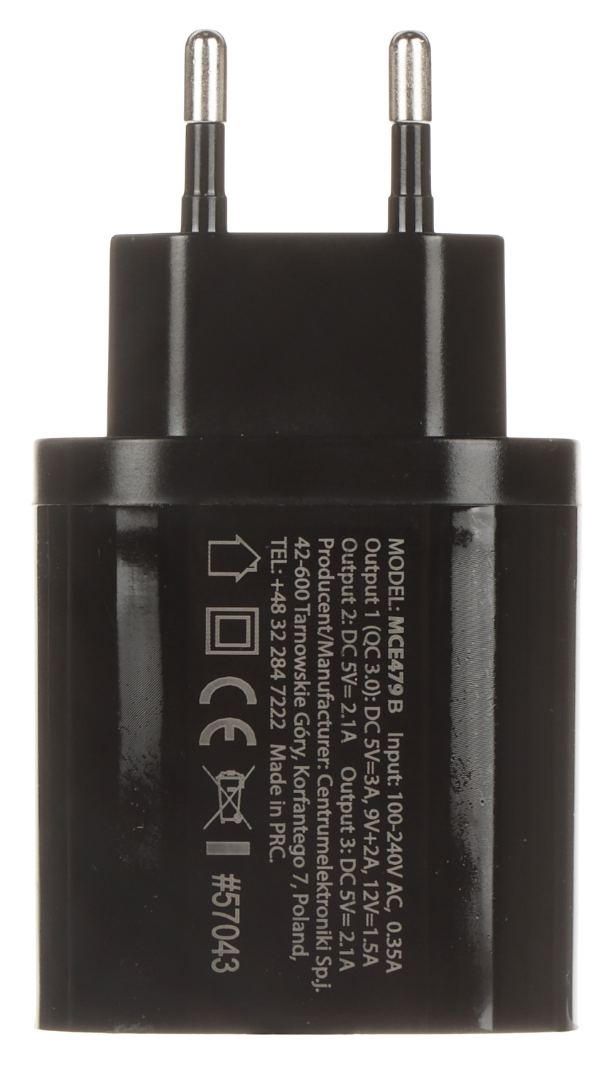 Input voltage: 100 ... 240 V AC ; Output voltage: 5 / 9 / 12 V DC - 1 output, 5 V DC - 2 output, 5 V DC - 3 output ; Output current: 3 / 2 / 1.5 A - 1 output, 2.1 A - 2 output, 2.1 A - 3 output ; Output: 3 x USB-A ; Main features: Quick Charge 3.0 - fast charging ;