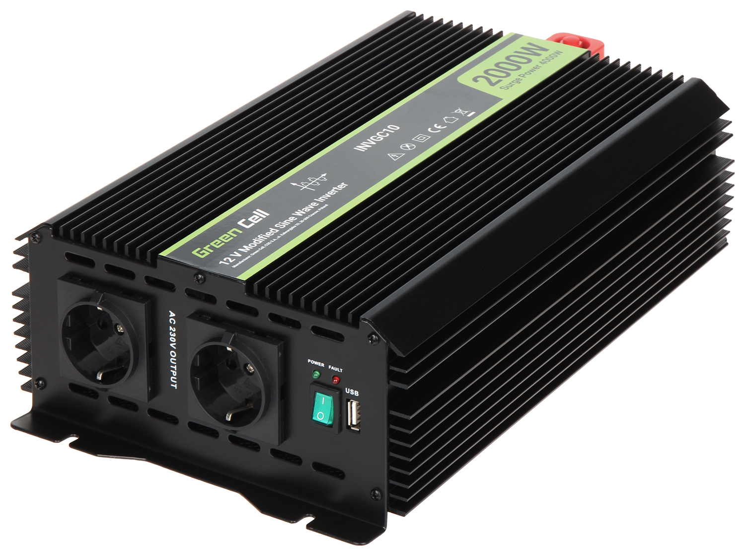 Type: Increasing the voltage, DC/AC ; Power voltage: 12 V DC ; Output voltage: 230 V AC (Approximated Sine Wave) ; Power: 4000 W (max), 2000 W (continuous operation) ; Length of the cables: 0.5 m ;