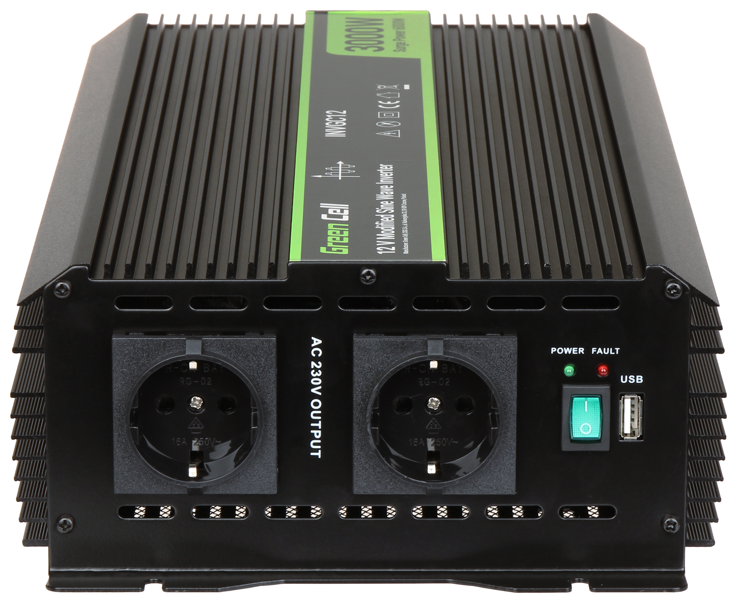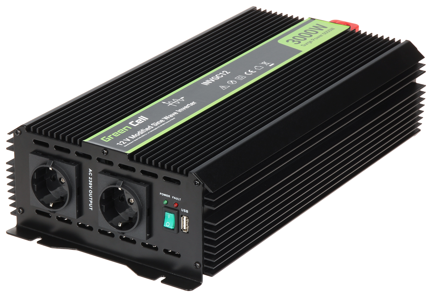 Type: Increasing the voltage, DC/AC ; Power voltage: 12 V DC ; Output voltage: 230 V AC (Approximated Sine Wave) ; Power: 6000 W (max), 3000 W (continuous operation) ; Length of the cables: 0.5 m ;