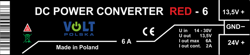 • Размеры: длина x ширина x высота [мм] 150 x 130 x 40 • Вес [кг] около 0,5 кг • Входное напряжение 20 - 30 В • Выходное напряжение - стандартное - 13В ± 1В • Максимальный мгновенный выходной ток менее 2 мин. 6 А • Максимальный продолжительный выходной ток 2 А • Защита от перегрузки, короткого замыкания и перенапряжения.