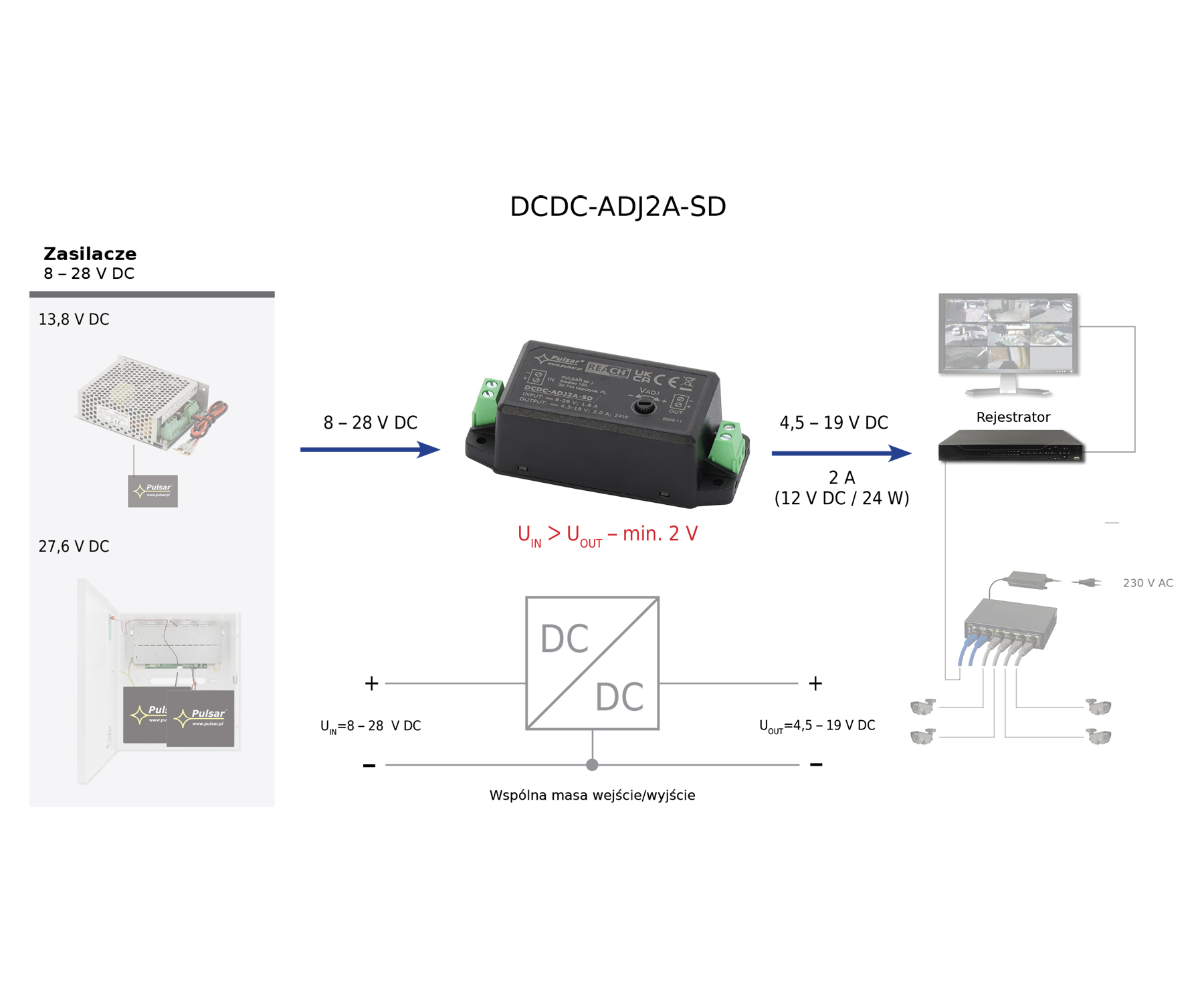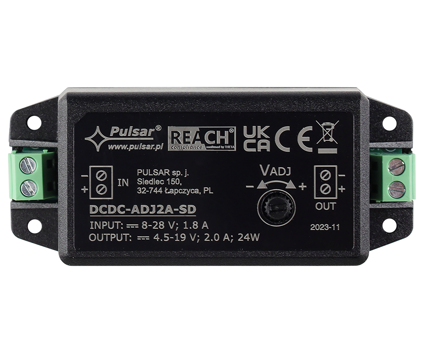 Type: Decreasing the voltage, DC/DC ; Power voltage: 8 V ... 28 V DC ; Output voltage adjustment: Precision potentiometer adjustment ; Output voltage: 4.5 V ... 19 V DC ; Output current: 2 A (max) ; Power: 24 W (max) ;