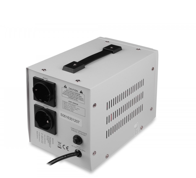 • Мощность: 2000 ВА • Диапазон входного напряжения: 150–270 В • Входная частота: 50 Гц • Выходное напряжение: 230 В • Точность вывода: 8% • Время задержки: 180 с / 6 с • Защита от перегрузки: ДА (предохранитель) • Длина: 24 см. • Высота: 18 см. • Ширина: 15 см. • Вес: 3,9 кг