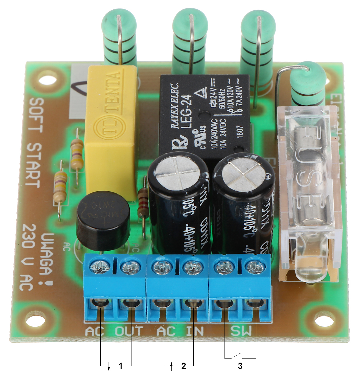 "Soft Start" module limits temporarily high inrush current of the inductive receivers at power up.;