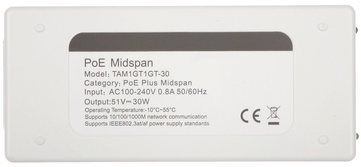 Standards: PoE (802.3af/at) - 30 W ; Input voltage: 100 ... 240 V AC ; Output voltage: 53 V DC ; Supported data rates: Supported data rates 10 / 100 / 1000 Mbps - Gigabit Ethernet, Support for Midspan mode ; Output power: 30 W ;