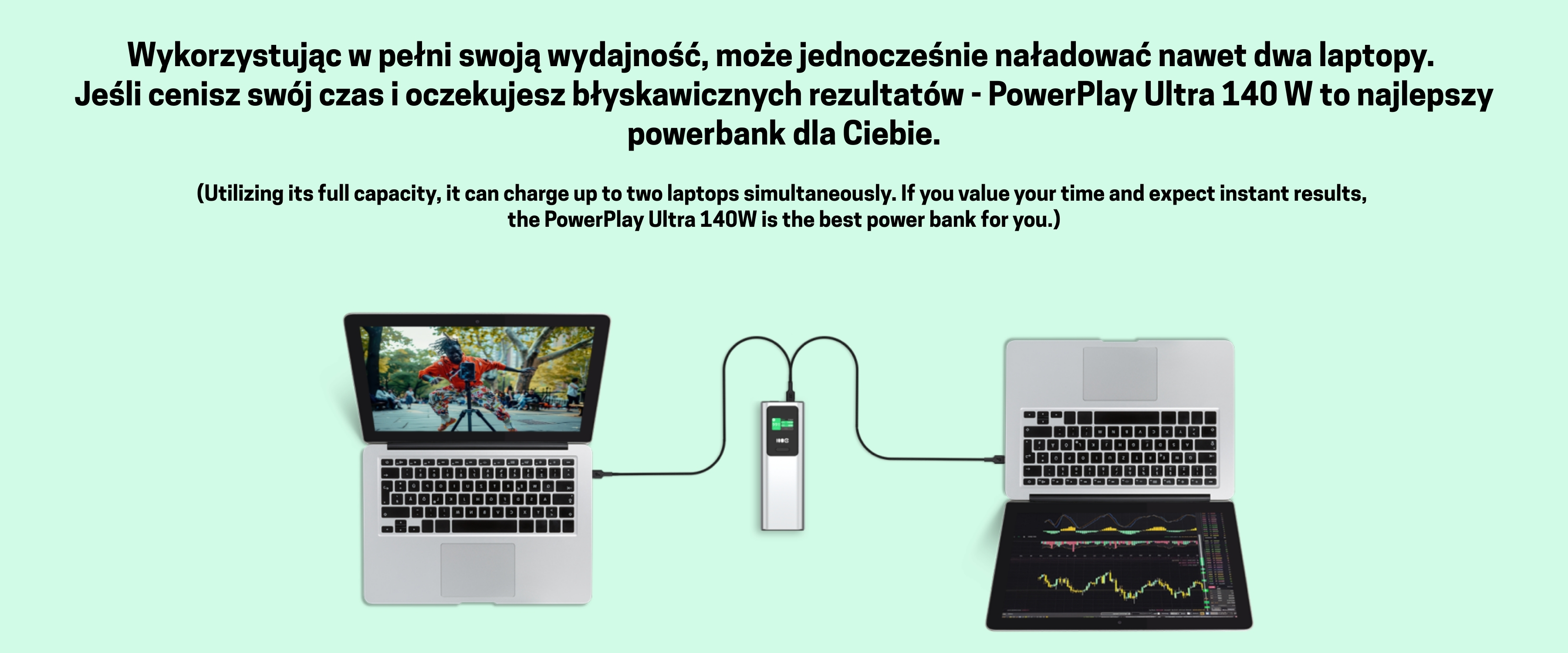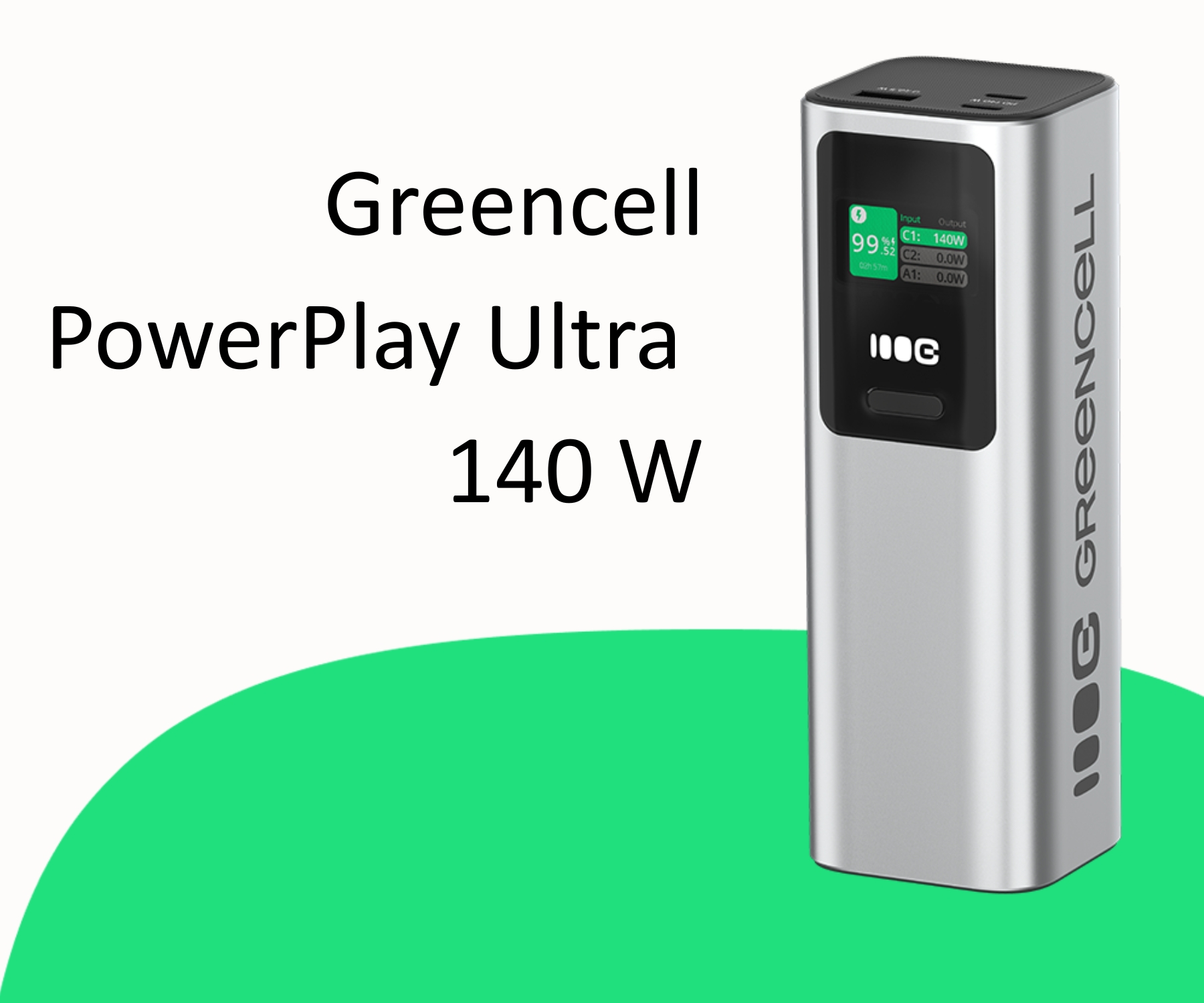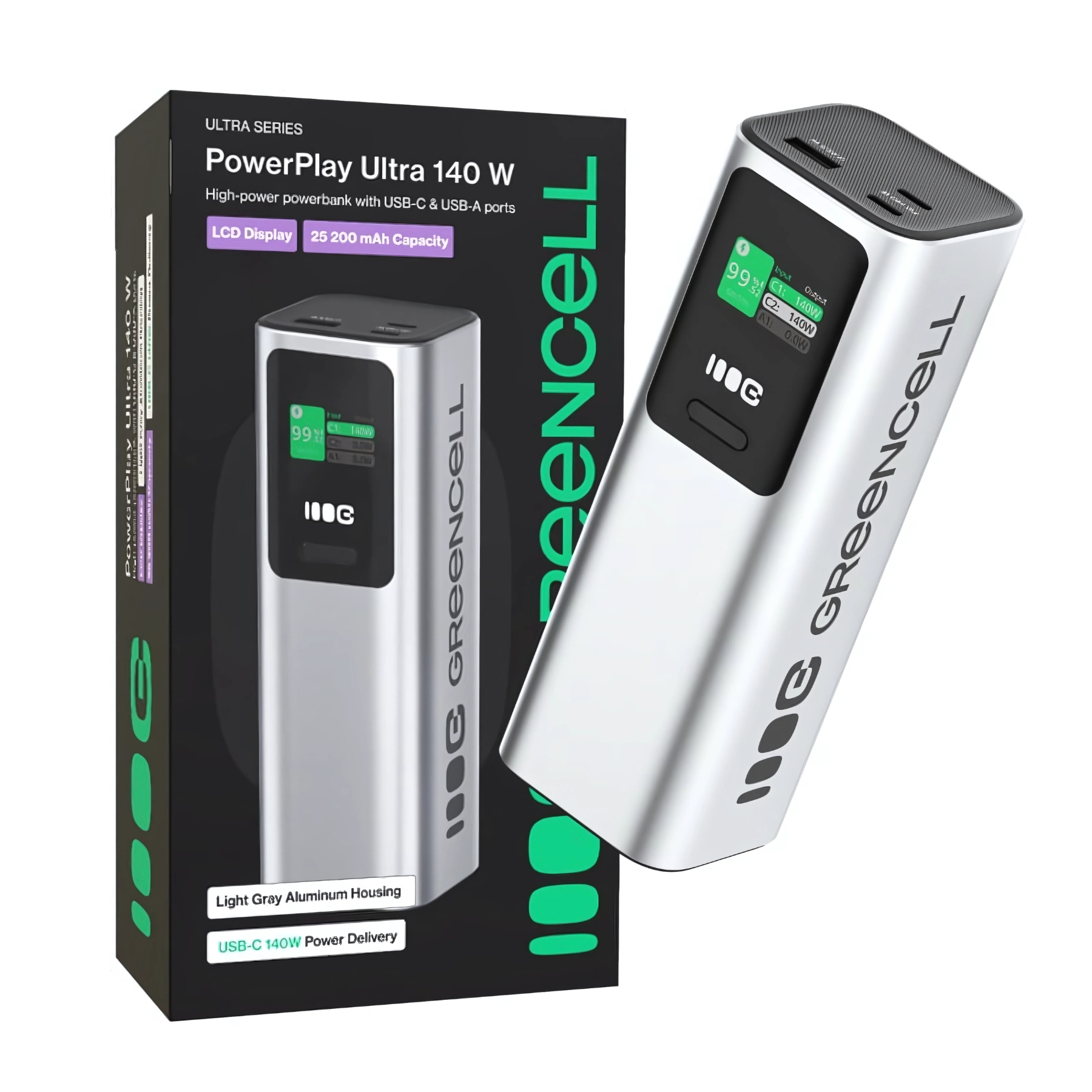 The Greencell PowerPlay Ultra 25200 mAh 140 Watt is a powerful powerbank with USB-C and USB-A (Power Delivery, Quick Charge) ports, an easy-to-read LCD display, the ability to charge devices and itself simultaneously, and aviation compliance - ideal for quickly and safely powering laptops, smartphones and other devices while traveling or in the office.; Battery capacity: 25200 mAh ; Maximal load power: 140 W ; Number of inputs: 2 pcs ; Number of outputs: 3 pcs ; Power outputs: USB-C1/USB-C2 USB-A ; Operation: Power Delivery, Quick Charge, Adaptive Fast Charging, Huawei Fast Charge Protocol, Huawei SuperCharge Protocol ;