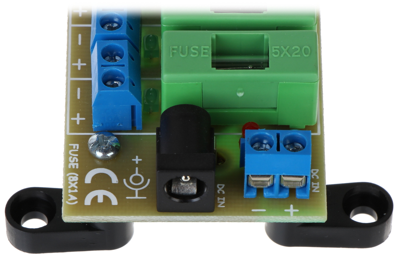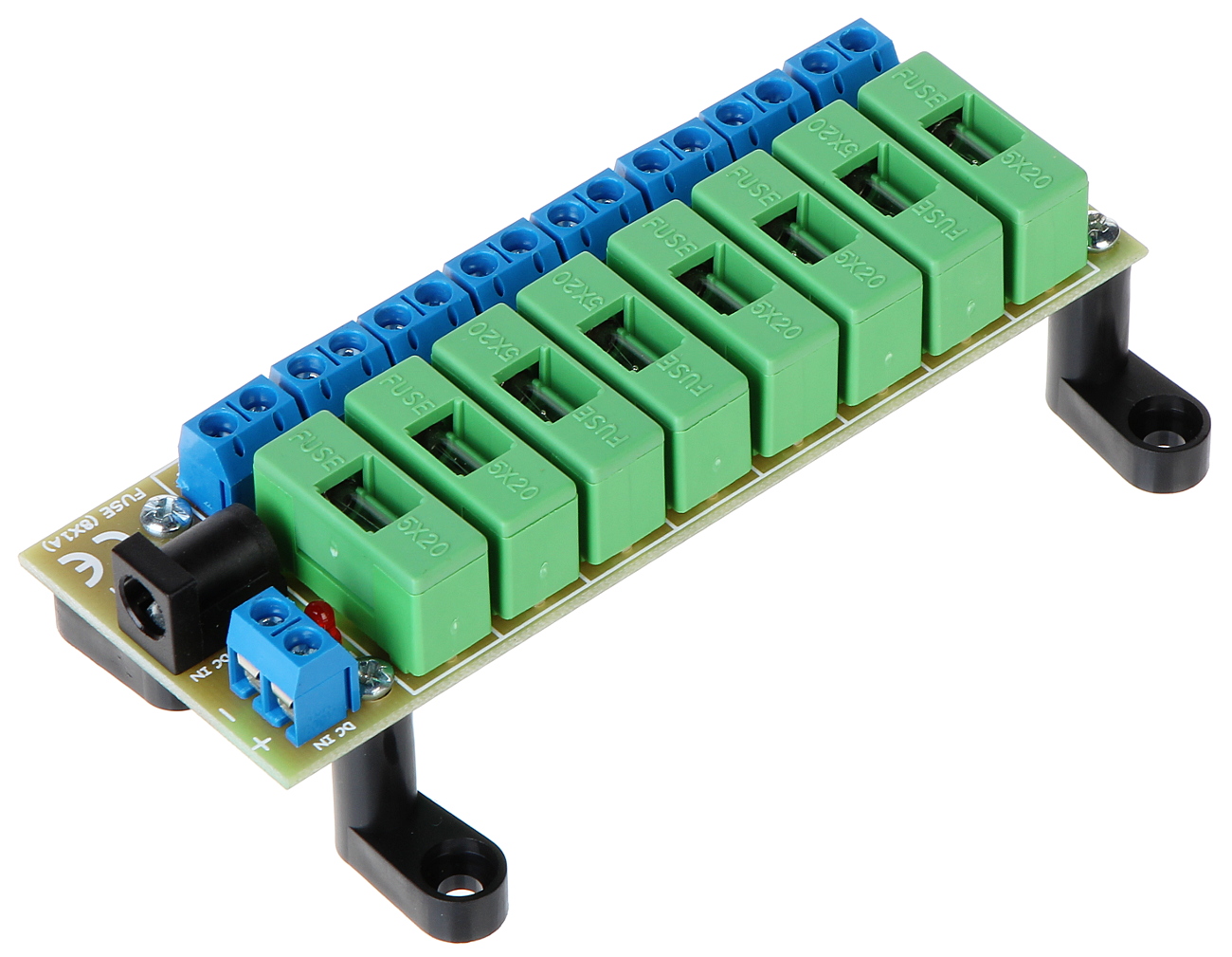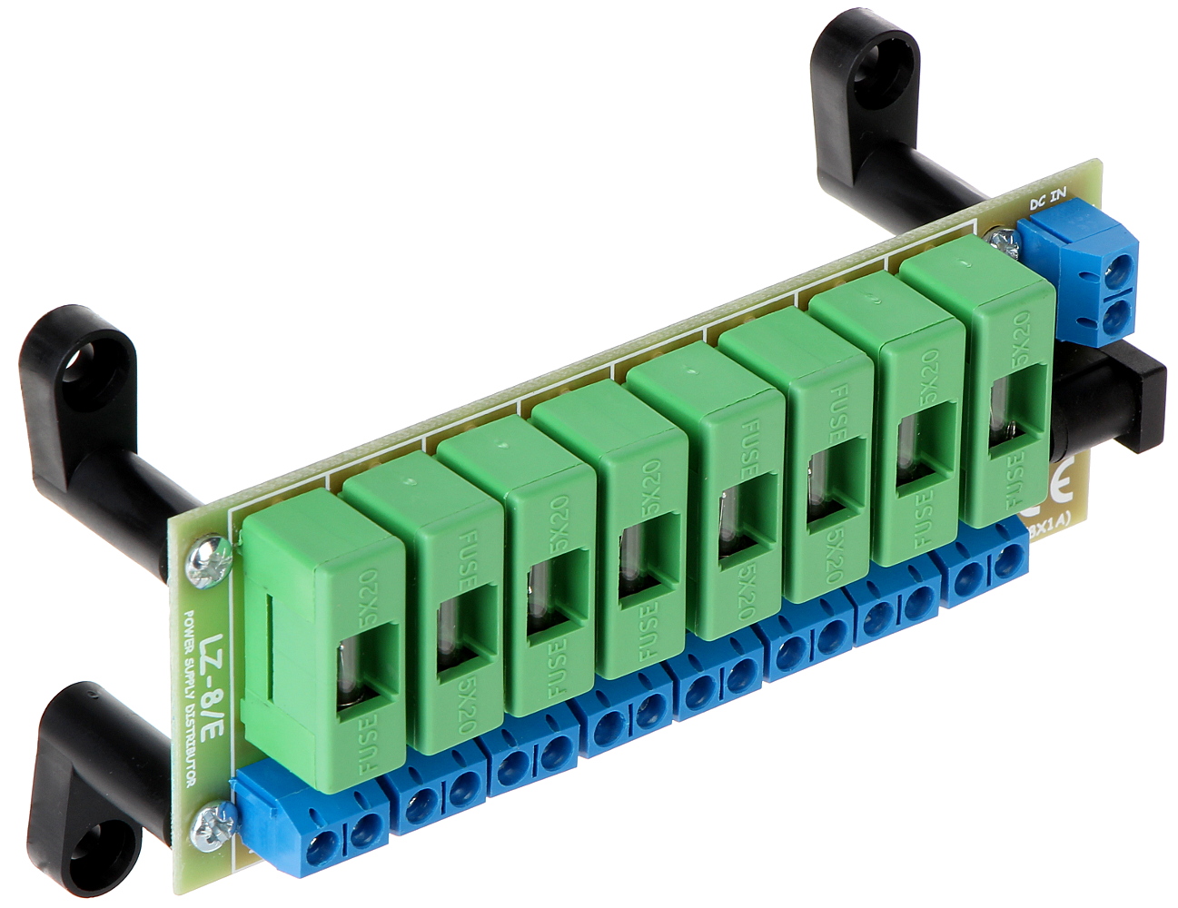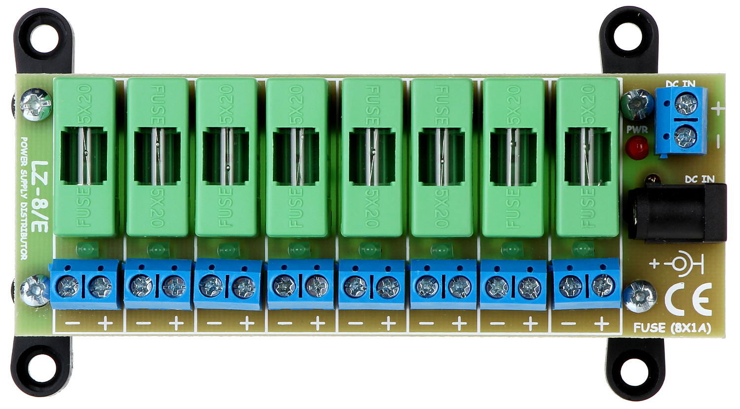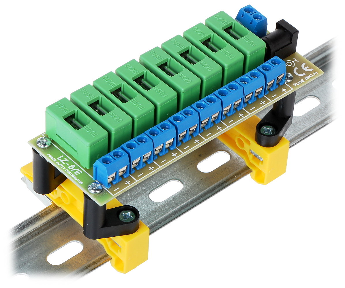 The LZ-8/E is a passive device and allows to distribute the power supply; Number of power outputs: ; Max. output current for single output: 1 A ; Protection type: 8 x 1 A 5/20mm delayed fuse ;