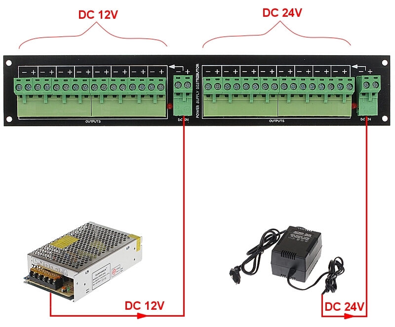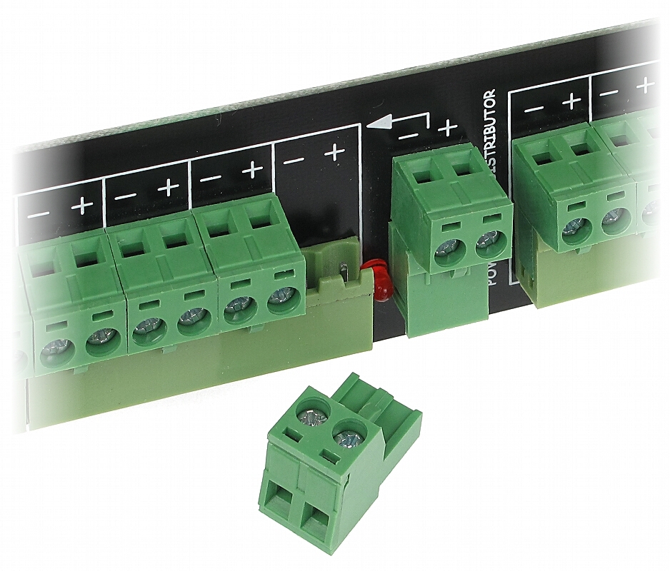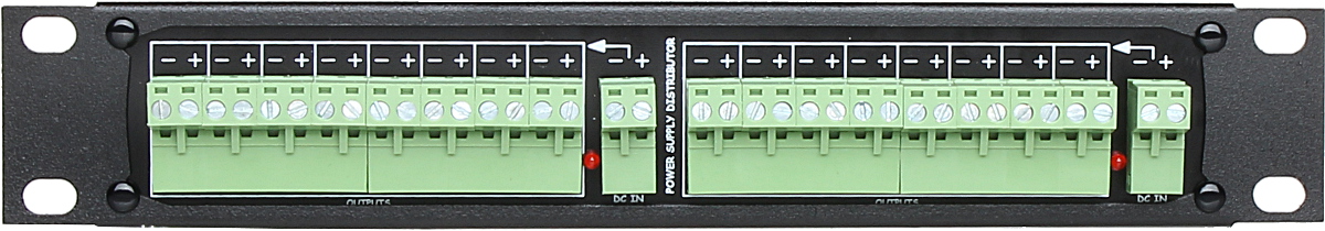 The device enables power distribution inside RACK cabinets from a single higher power supply source (or several power sources) to maximum 16 devices with max. single output current of 1A; Housing type: Rack 10" ; Dimensions: 255 x 41 x 40 mm ;