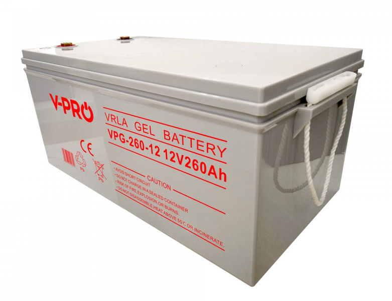 Номинальное напряжение: 12 V Номинальная емкость: 260 Ah Общая высота: 226 mm Высота: 218 mm Ширина: 268 mm Длина: 522 mm Вес: 64,0 kg ± 3% Емкость (при 25°С) 20ч (10,5В): 260Ah Емкость (при 25°С) 10ч (10,5В): 251Аh Емкость (при 25°С) 3ч (10,2В): 189Аh Емкость (при 25°С) 1ч (9,6В): 150Аh Внутреннее сопротивление (при 25°С): 2,1 mOm Емкость: (40°С): 102% Емкость (25°С): 100% Емкость (0°С): 85% Емкость (-15°С): 65% Саморазряд (25°C) 3msc: 91% от номинальной емкости Саморазряд (25°C) 6msc: 82% от номинальной емкости Саморазряд (25°C) 12 мсек: 64% от номинальной емкости Рекомендуемая рабочая температура: 25°С ± 3°С Диапазон рабочих температур - нагнетание: от -15°C до 50°C Диапазон рабочих температур — зарядка: от -10°C до 50°C Диапазон рабочих температур - хранение: от -20°C до 50°C Буферное зарядное напряжение (25°C): 13,5-13,8 V постоянного тока Напряжение циклической зарядки (25°C): 14,4–14,7 V постоянного тока Максимальный зарядный ток: 65А Максимальный ток разряда: 2500А Расчетный срок службы (25°С): 12 лет