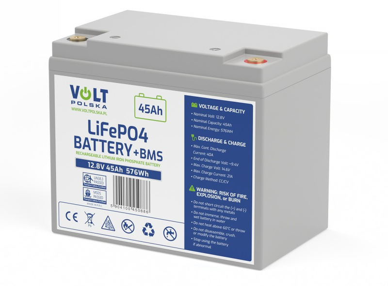 • Номинальное напряжение: 12,8 В. • Номинальная емкость: 45 Ач • Высота: 170 мм • Ширина: 166 мм • Длина: 198 мм • Вес: 4,6 кг • Максимальный ток разряда: 40 А • Срок службы: 2000 циклов (100% глубина разряда)