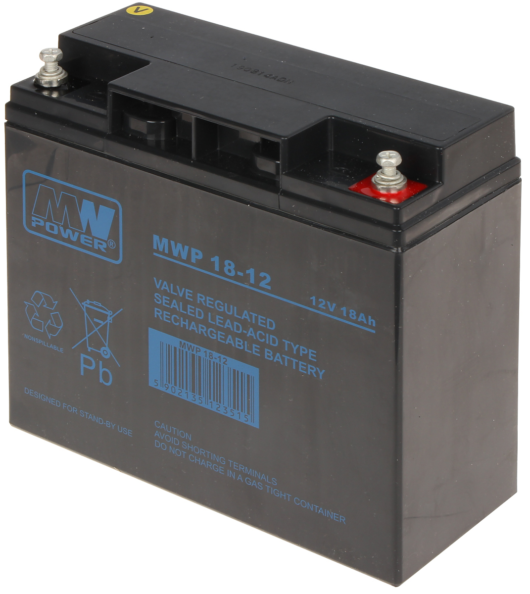 Battery capacity: 18 Ah ; Rated voltage: 12 V ; Battery type: Maintenance-free AGM (Absorbent Glass Mat) battery ; Battery lifetime: > 12 years ;