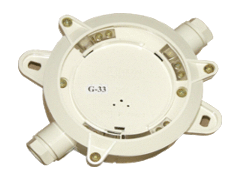 Назначение Розетка G-33 предназначена для соединения пожарных извещателей с системой пожарной сигнализации. В розетке устанавливаются искробезопасные извещатели DIO-37Ex, PUO-35Ex или извещатели ряда 30 которые работают в тяжелых условиях. Конструкция Розетка имеет четыре зажима: 1- отрицательный полюс шлейфа сигнализации, 2- провод к внешнему индикатору срабатывания, 3 и 3’ - положительный полюс шлейфа сигнализации. Зажима 3 - 3’ соединяет извещатель, что позволяет, путём контроля целостности шлейфа сигнализации, контролировать наличие всех извещателей установленных в шлейфе сигнализации. Розетка крепится к потолку двумя винтами и распорными штифтами. Розетка G-33 имеет два сальниковых уплотнителя проводов. Манжета которая крепится 3-мя винтами препятствует изъятию извещателя без применения инструмента. Технические данные Диаметр присоединенных проводов,мм макс. 2 Габаритные размеры, мм Ф118 х 47 Расстановка крепежных отверстий,мм 140 |