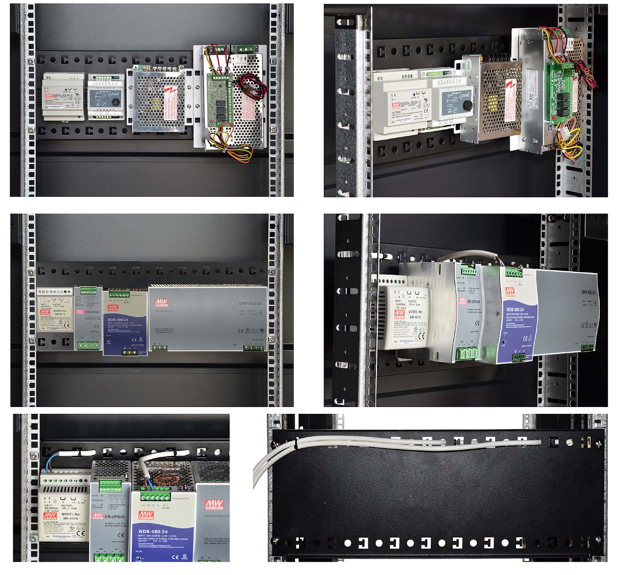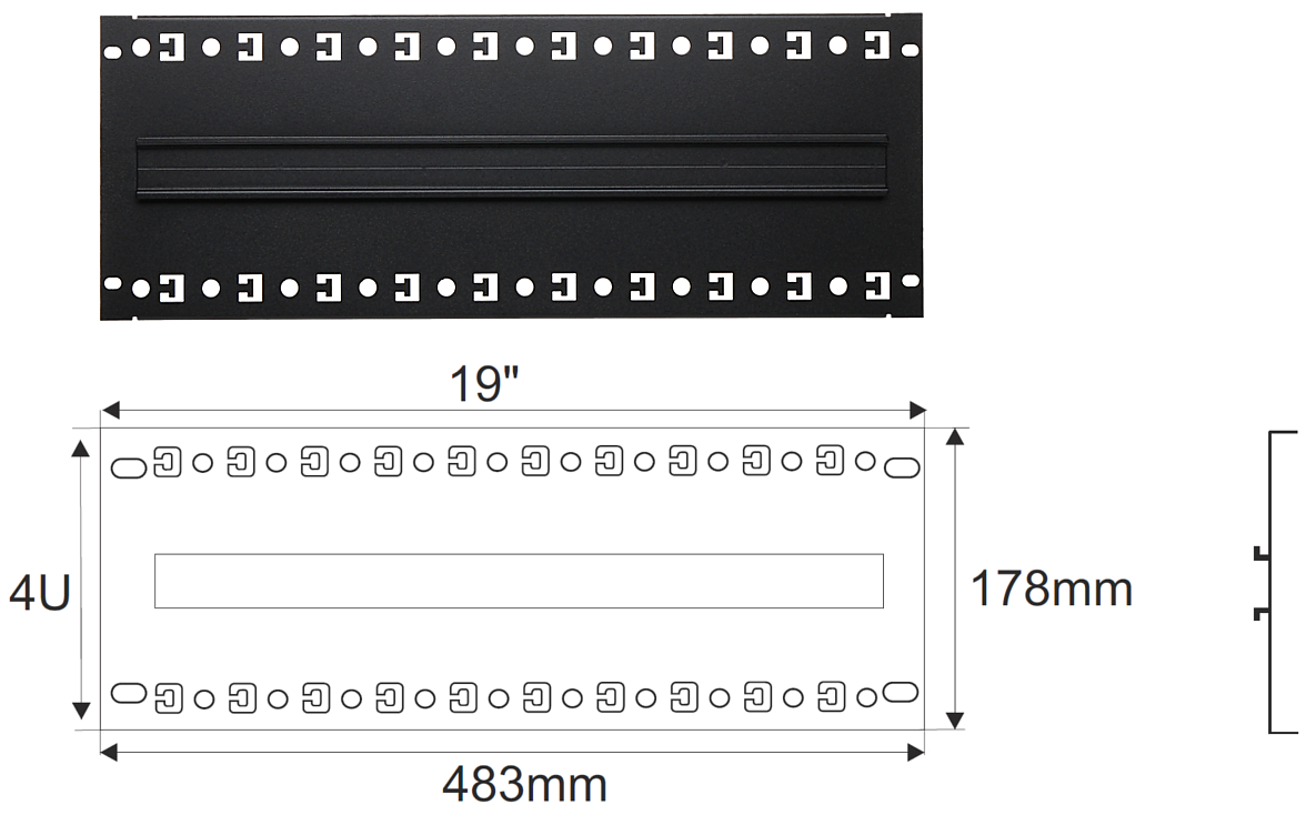 The A19-TS-35/BL-4U mounting metal plate is designed for mounting devices compliant with DIN standard in the rear part of a Rack 19" cabinet;