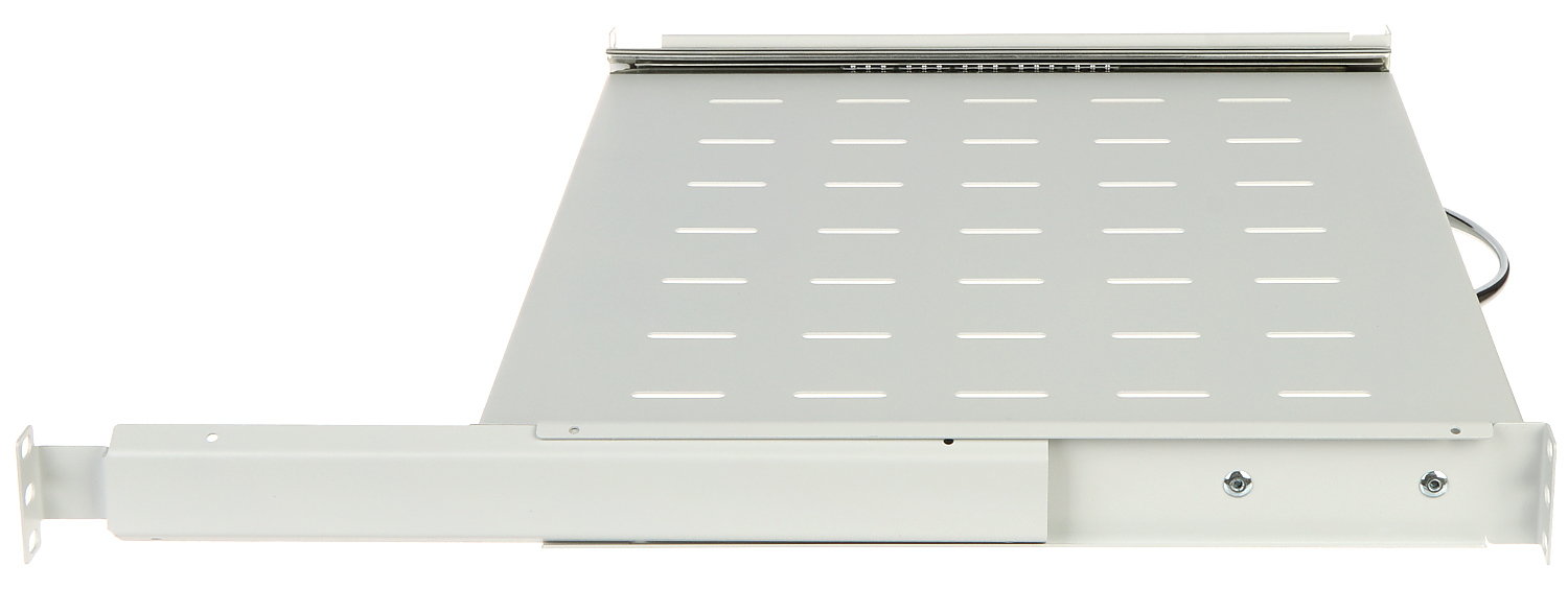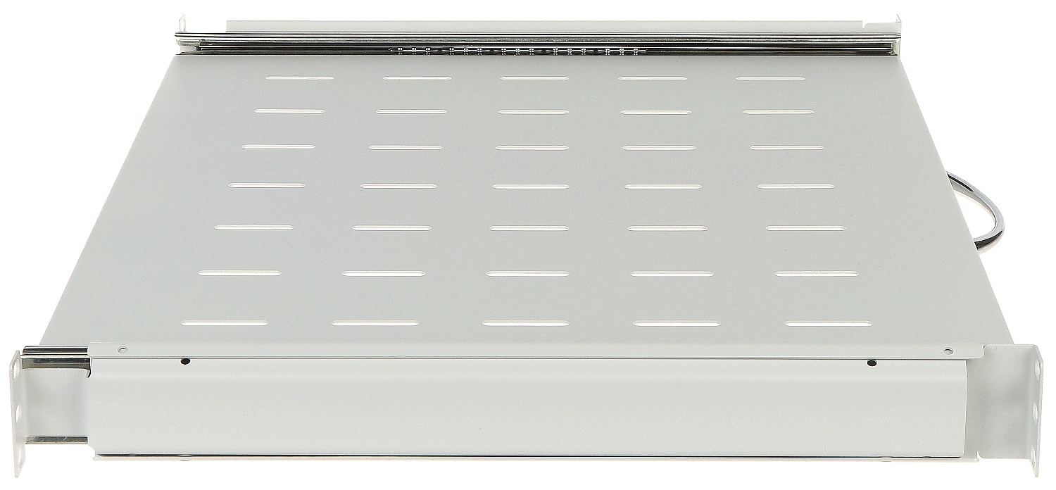 The shelf for the RACK 19" cabinet, designed for devices with housings which don't support the RACK cabinet mounting standard; Height: 1 U ; Mount: four-point ; Color: Gray RAL7035 ; Application: Rack 19" - depth ≥ 390 mm ;