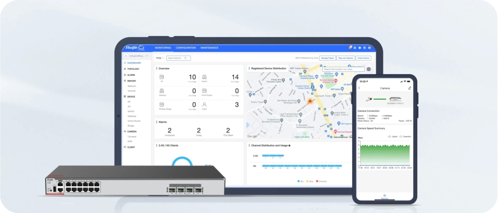 • Switch is managed through the web and the cloud (Ruijie Reyee application)