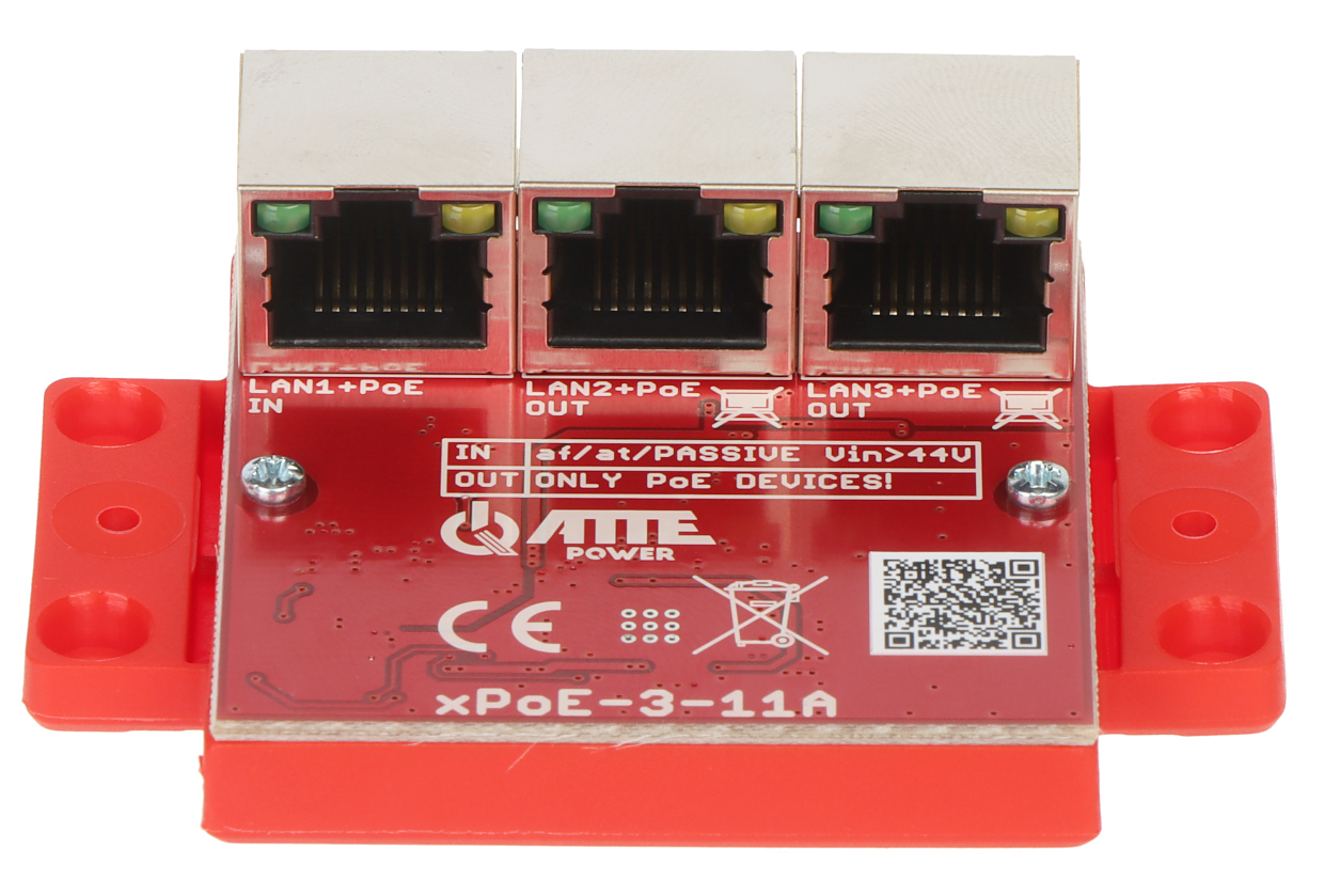 LAN ports: 1 x RJ45 10/100 Base-T + power input : PoE (802.3af/at) / Passive PoE, 2 x RJ45 10/100 Base-T + Passive PoE ; Transmission speed: 10 / 100 Mbps : 1 LAN port + 2 LAN & PoE ports ; Maximal total power: 40 W ; Main features: Sequential start of PoE OUT outputs ;