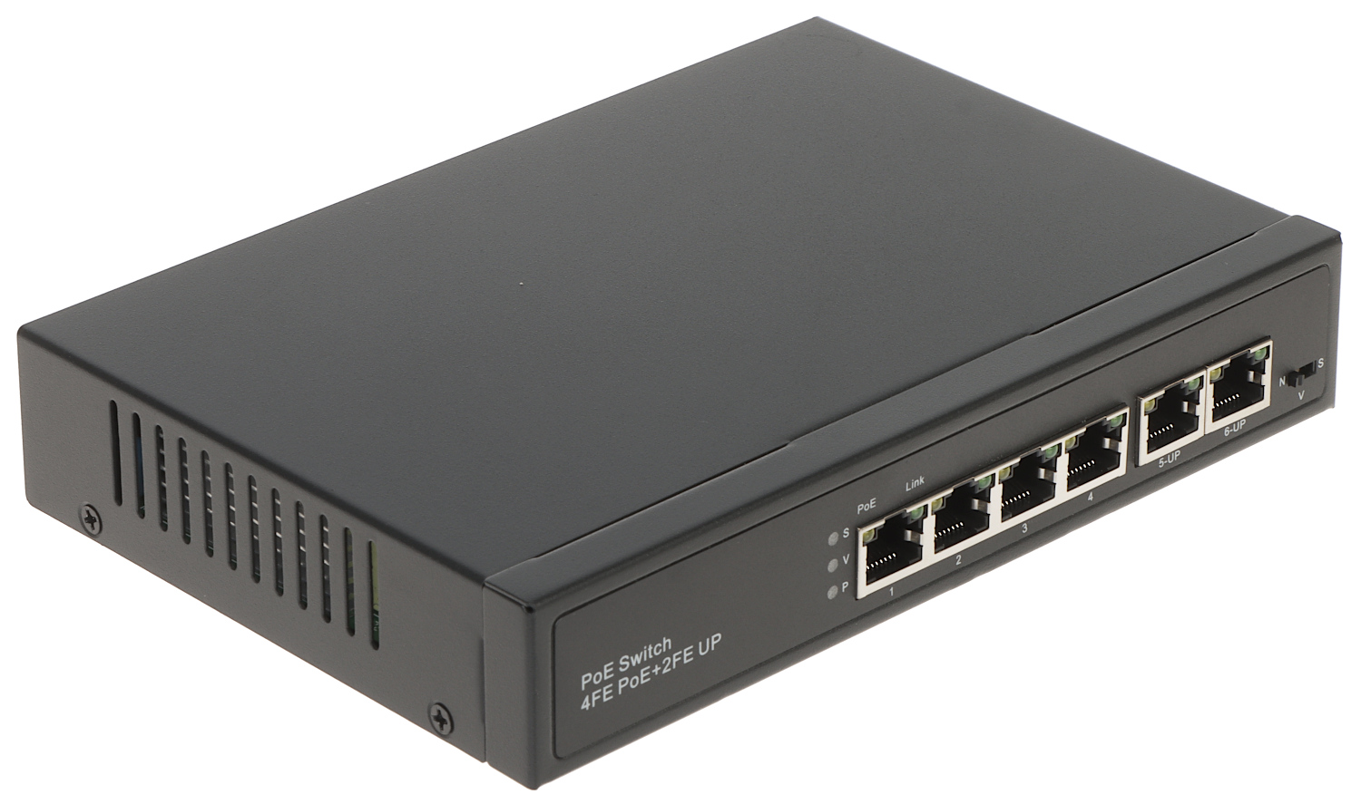 LAN ports: 4 x RJ45 ( 1 x Hi-PoE + 3 x PoE (802.3af/at) ), 2 x RJ45 - Uplink ; Transmission speed: 10 / 100 Mbps : 2 x LAN port - Uplink + 4 x LAN & PoE port ; Maximal total power: 65 W ;