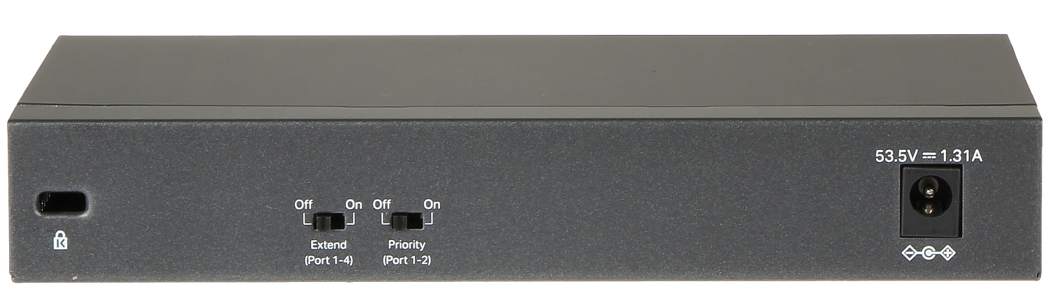 LAN ports: 6 x RJ45 ( 4 PoE+ ) ; Transmission speed: 10 / 100 Mbps : 2 LAN port + 4 LAN & PoE ports ; Maximal total power: 67 W ;
