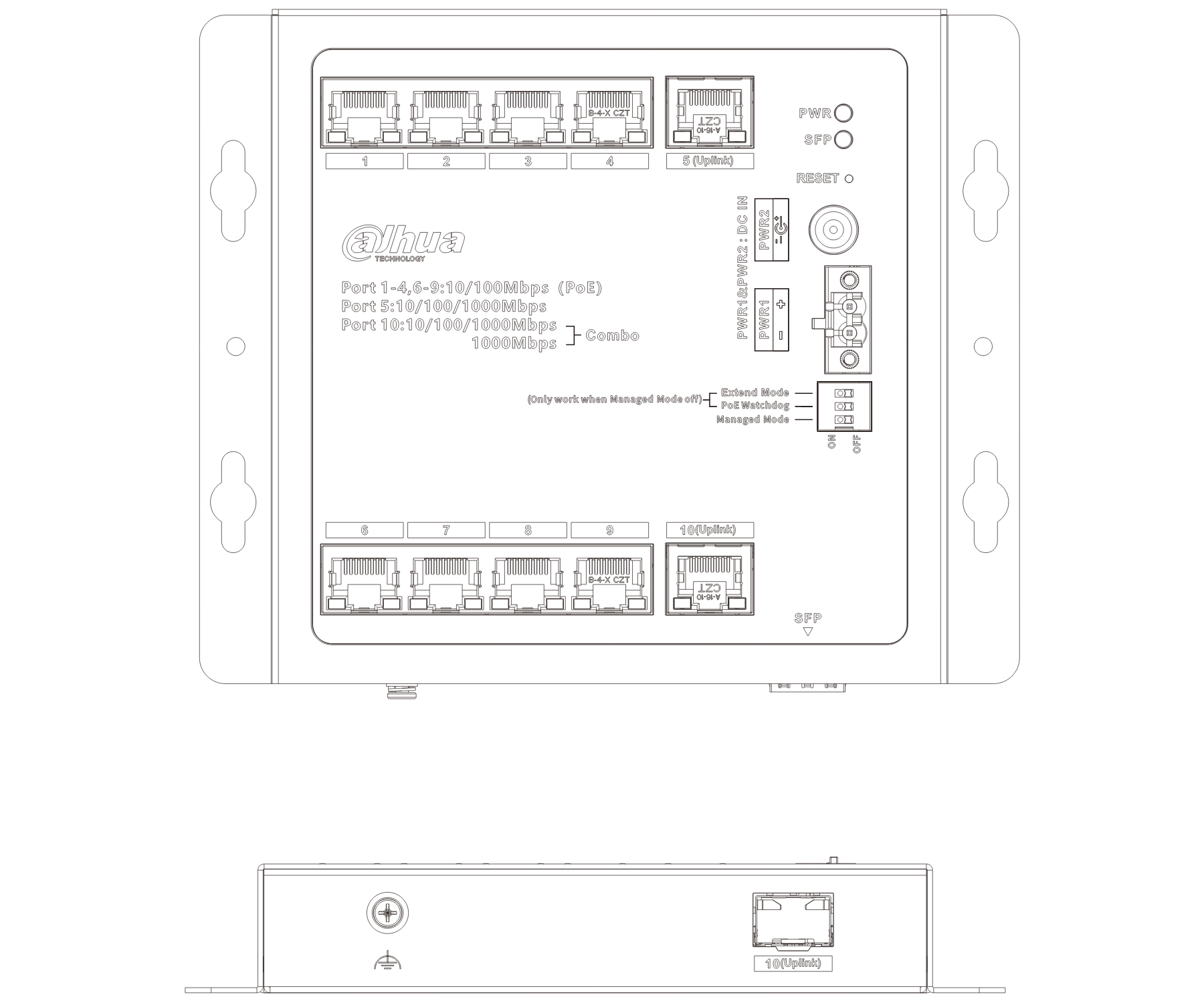 LAN ports: 1 x RJ45 10/100 Base-T + Hi-PoE (802.3af/at/bt), 7 x RJ45 10/100 Base-T + PoE (802.3af/at), 1 x RJ45 (Uplink) 10/100/1000 Base-T, 1 x RJ45 (Uplink) 10/100/1000 Base-T - Combo: SFP / RJ45 port, 1 x SFP (Uplink) 1000 Base-X - Combo: SFP / RJ45 port ; Management; Transmission speed: 10 / 100 Mbps - 8 LAN & PoE ports, 10 / 100 / 1000 Mbps - 2 LAN ports, 1000 Mbps - 1 SFP ports ; Maximal total power: 95 W ;