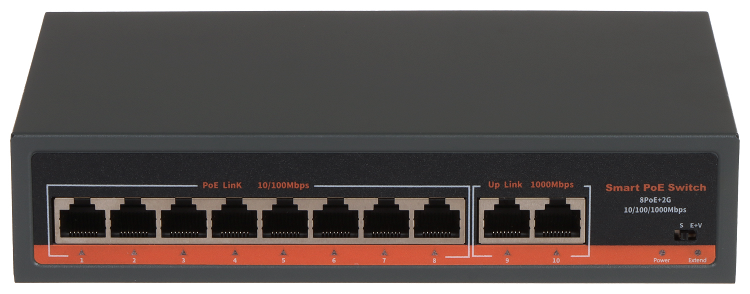 LAN ports: 10 x RJ45 ( 8 x PoE (802.3af/at) ) ; Transmission speed: 10 / 100 / 1000 Mbps : 2 x LAN port, 10 / 100 Mbps : 8 x LAN & PoE ports ; Maximal total power: 120 W ;