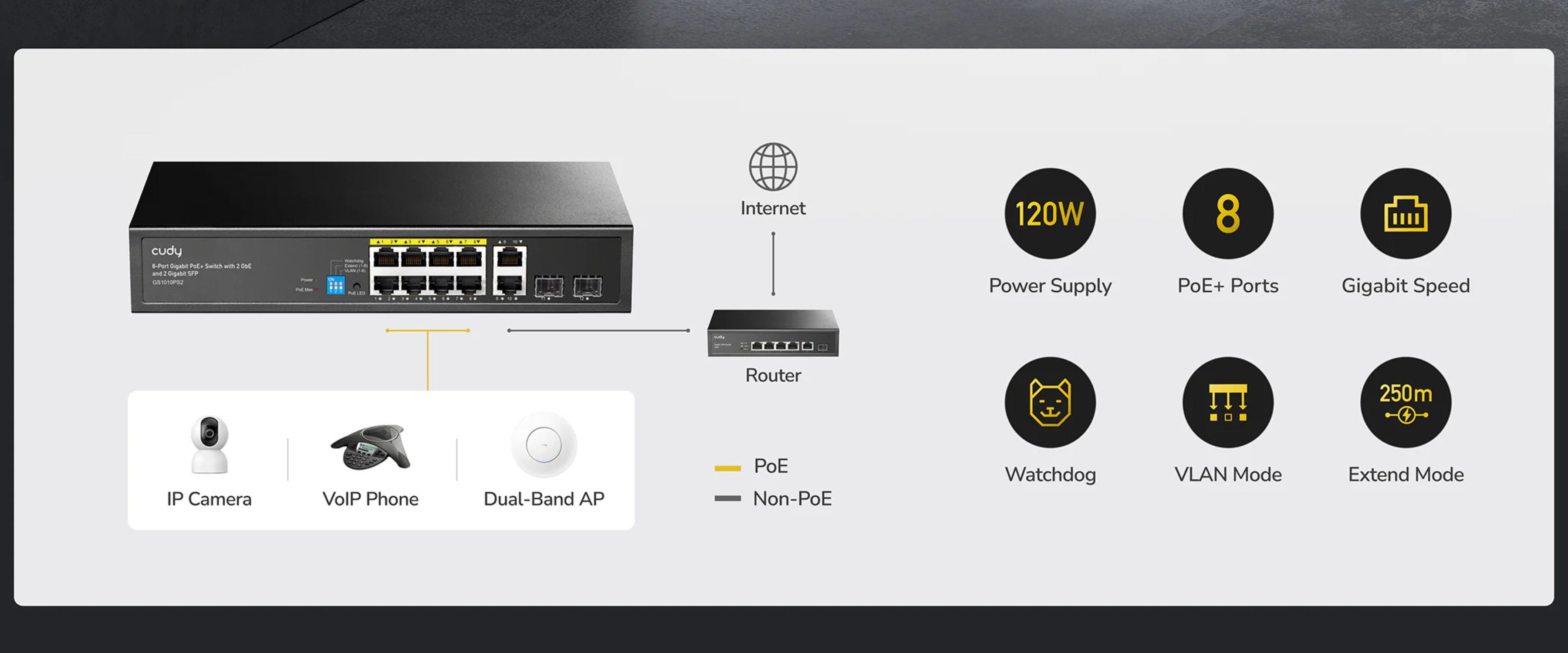 LAN ports: 8 x RJ45 ( 8 x PoE (802.3af/at) ) 2 x RJ45 - Uplink 2 x SFP - Uplink ; Transmission speed: 10 / 100 / 1000 Mbps : 8 LAN & PoE ports : 2 Uplink ports 1000 Mbps : 2 SFP ports ; Maximal total power: 120 W ; MAC addresses table: 2k ;