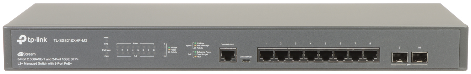 LAN ports: 8 x RJ45 100/1000/2500 Base-TX, 2 x port SFP+ - Uplink 1000 Base-X / 10 Gigabit Ethernet, 1 x RJ45 - Console, 1 x micro USB - Console ; Transmission speed: 100 / 1000 / 2500 Mbps - 8 LAN & PoE ports, 10 Gb/s - 2 SFP ports ; Maximal total power: 240 W ;
