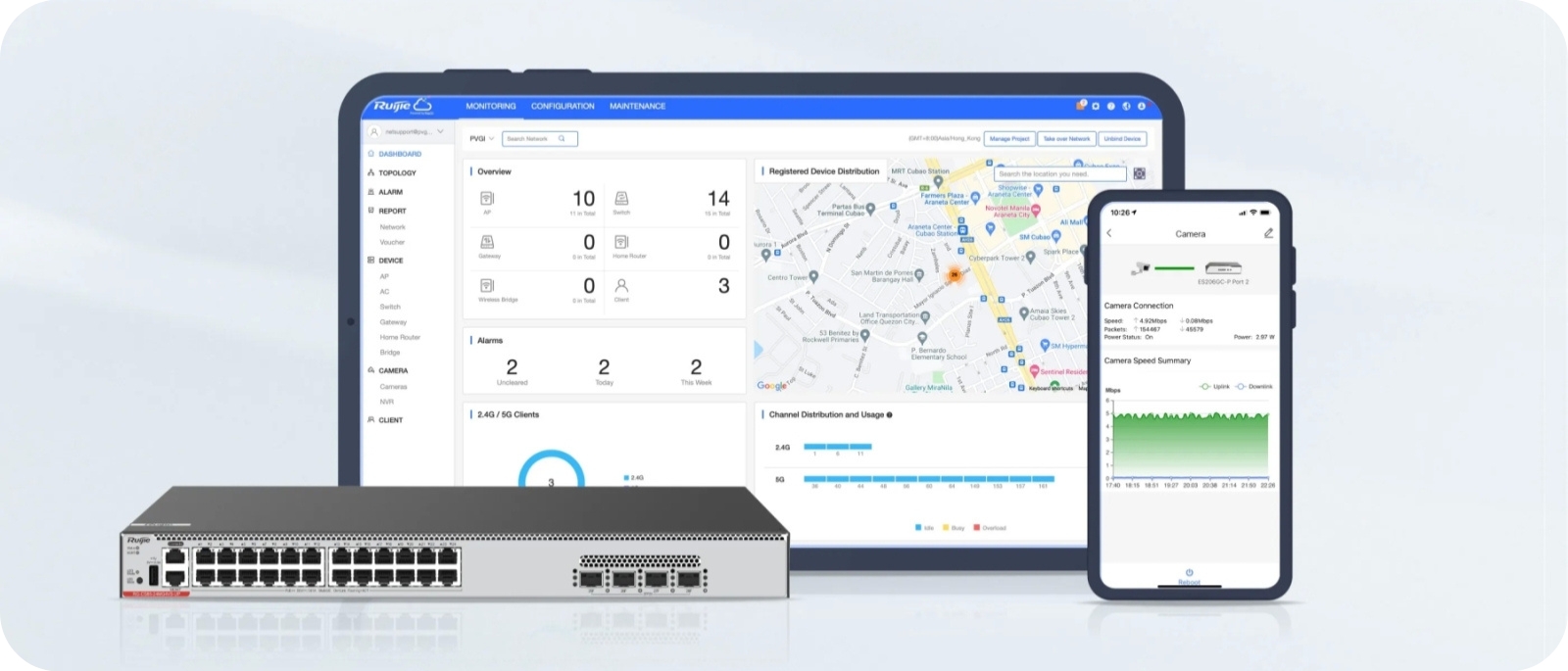 • Switch is managed through the web and the cloud (Ruijie Reyee application)