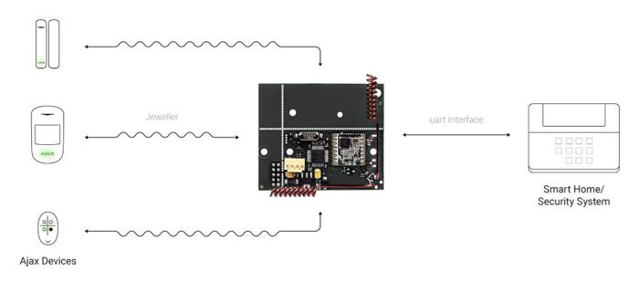 uartBridge - модуль-приемник для подключения датчиков Ajax к беспроводным охранным системам и smart home решениям. - Передает детальную информацию о подключенных датчиках через интерфейс UART - Поддерживает возможность постановки и снятия с охраны по команде централи - Позволяет реализовывать собственные решения для систем умного дома