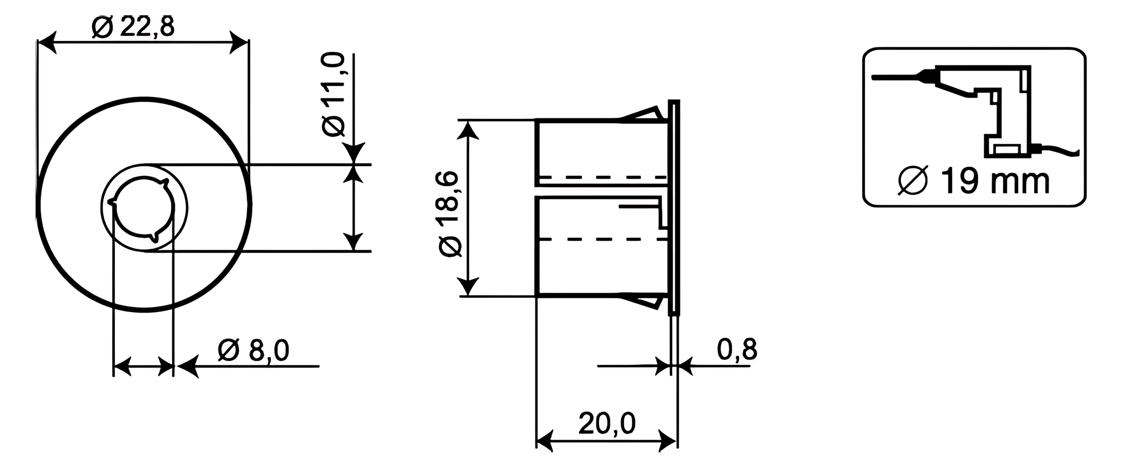 Dimensions: Ø 22.8 (with flange) x 20 mm