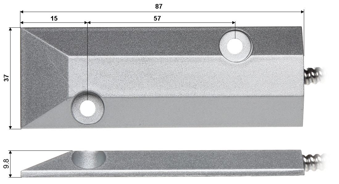 Detection: Gate opening ; Maximum reed switched voltage: 100 V ; Maximal switched current: 500 mA ; Make distance: 38 mm ; Break distance: 40 mm ; Main features: Rugged, metal sealed body ; Dimensions: 87 x 37 x 9.8 mm - Reed switch 87.6 x 35 x 41.5 mm - magnet ;